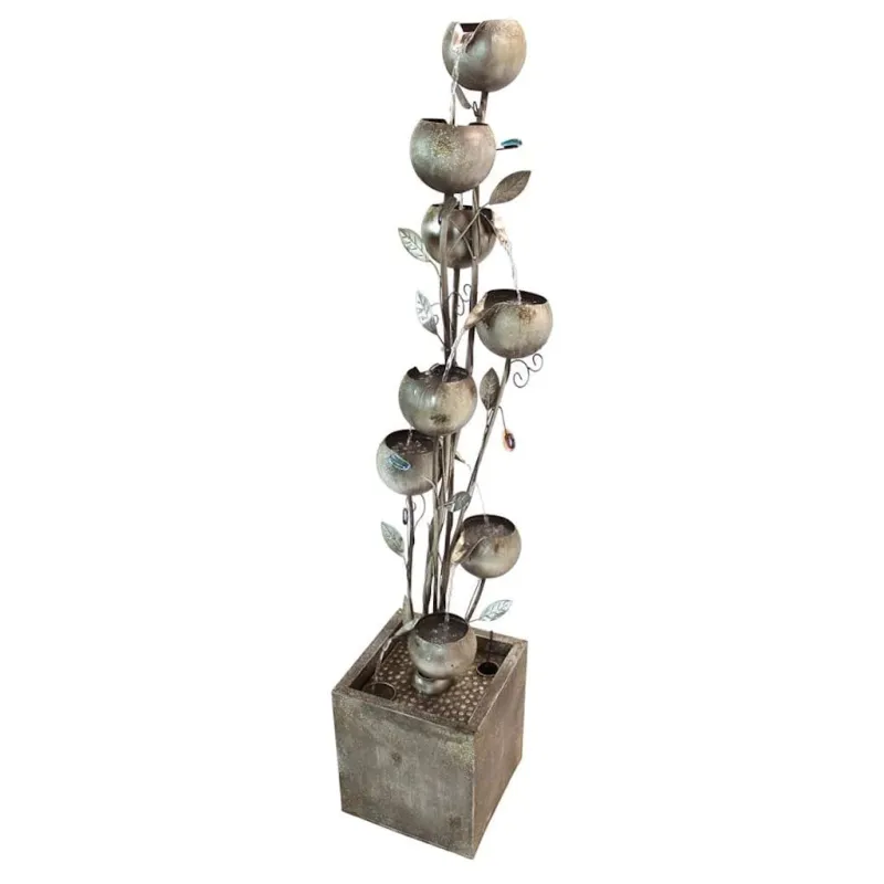 Introducing the Abstract Floral Cascading Fountain, a unique and stylish fountain that will make a statement in your home or patio. This fountain is crafted with hand-aged metal and includes natural glass cabochon accents, making it truly one-of-a-kind. With eight cascading streams of water flowing endlessly from each stylized metal flower basin, this fountain creates a peaceful and meditative atmosphere. It also comes with an integrated, UL-listed indoor/outdoor pump, making it a great investment in fountain art.