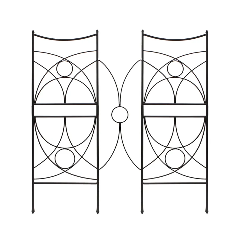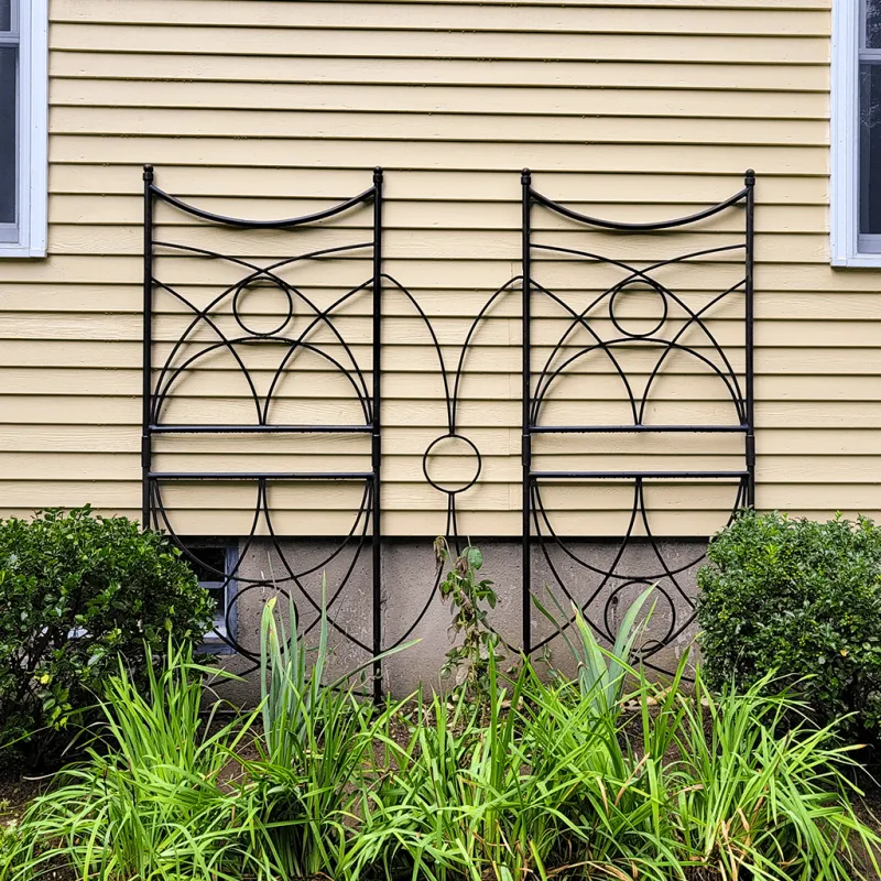 This wrought iron trellis boasts a contemporary style and ample contact points for climbing garden plants. It is a perfect garden accent for roses, clematis, and green screening.