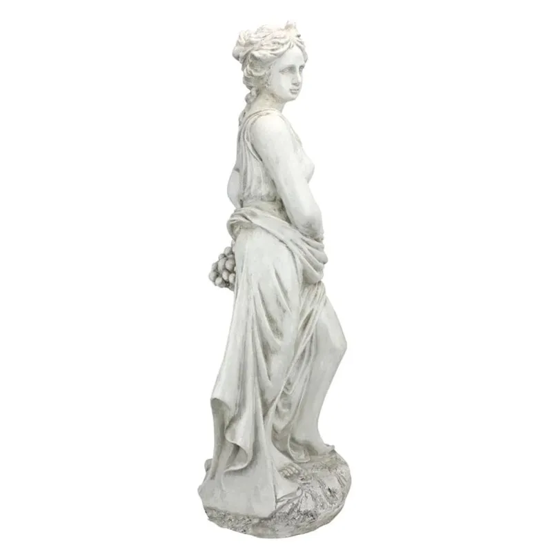 The Autumn Goddess sculpture is an allegory representing one of the goddesses of the seasons in the Neoclassical style. The goddess holds a cluster of grapes surrounded by the season’s fruits. The sculpture was inspired by the Roman tales of the Horae, known for their voluptuousness. The Autumn Goddess sculpture is based on an original sculpture found on an English estate and is very detailed, from the draped gown to the beautiful face. The sculpture is made of quality designer resin and is finished in antique stone, making it perfect for enjoying during any season.