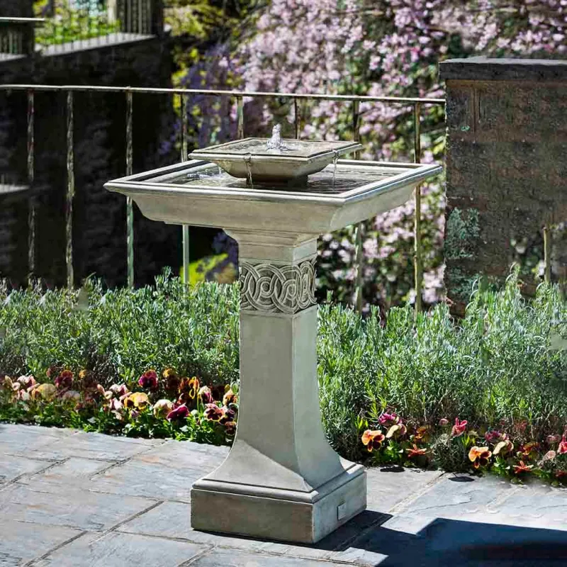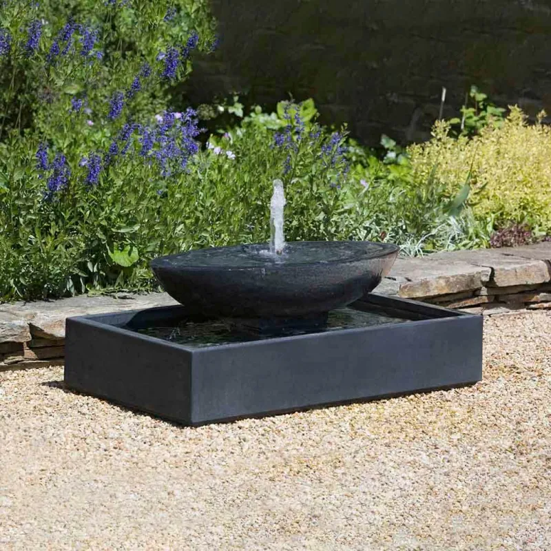 - A properly prepared base of gravel, flagstone, or other hardscaping material is preferred to maintain stability for outdoor fountain installations. Hanging fountains should be properly anchored to avoid damage to walls and fountains. Remember to account for water weight when choosing your anchor.