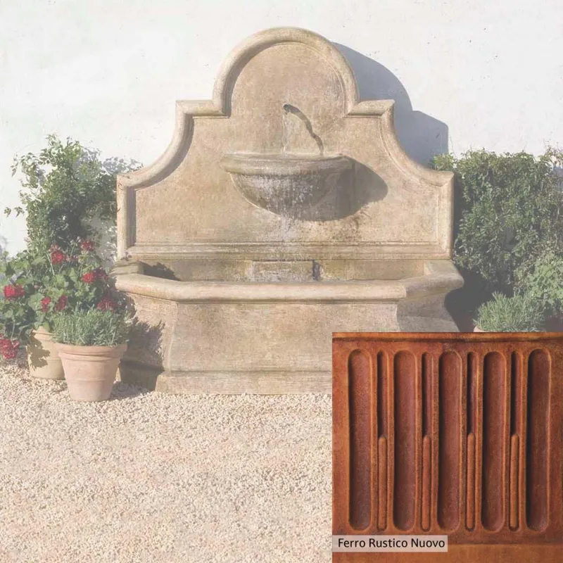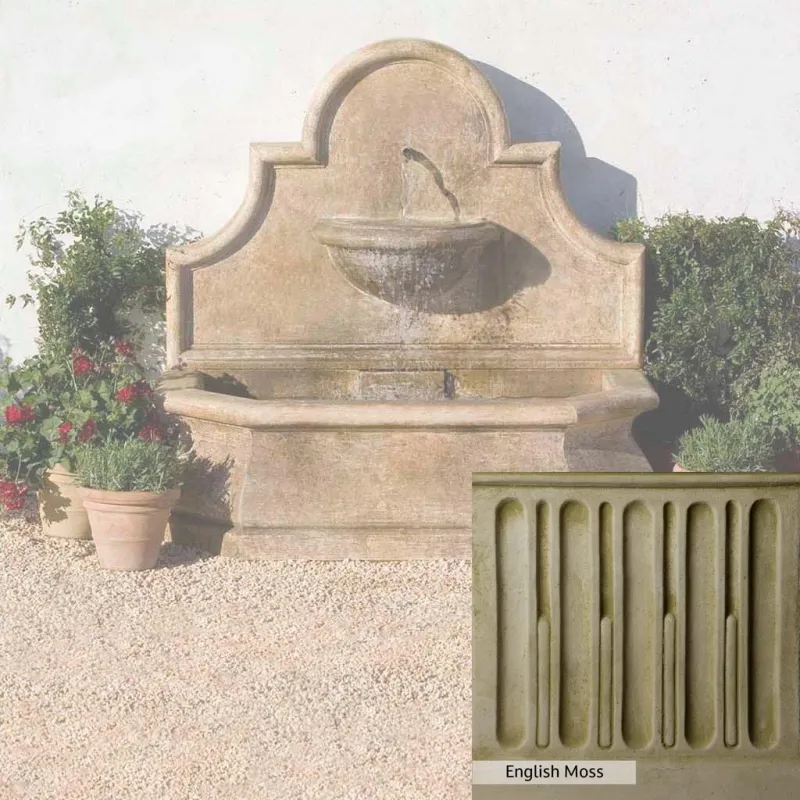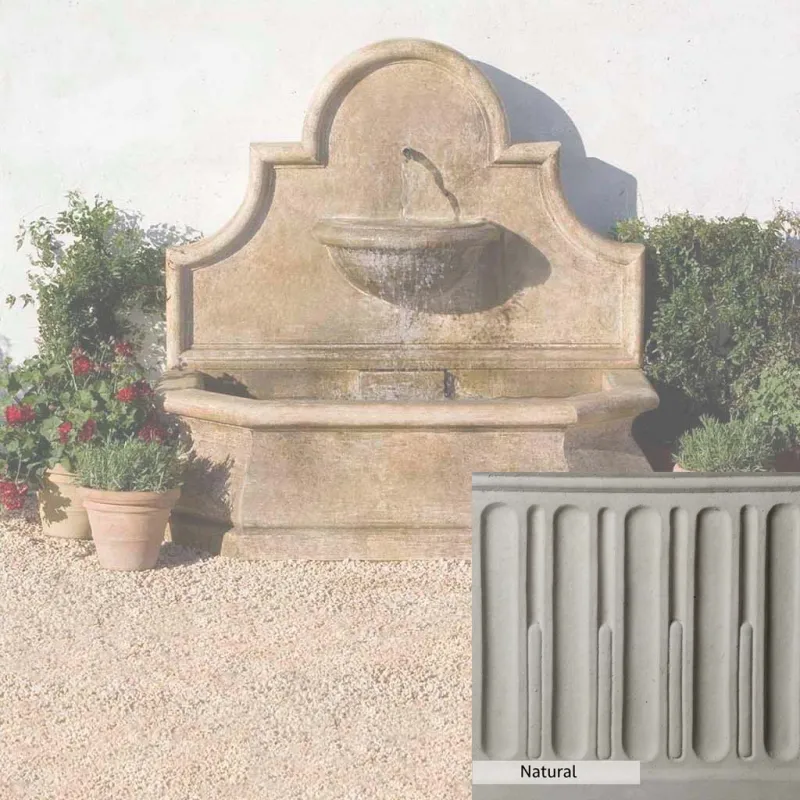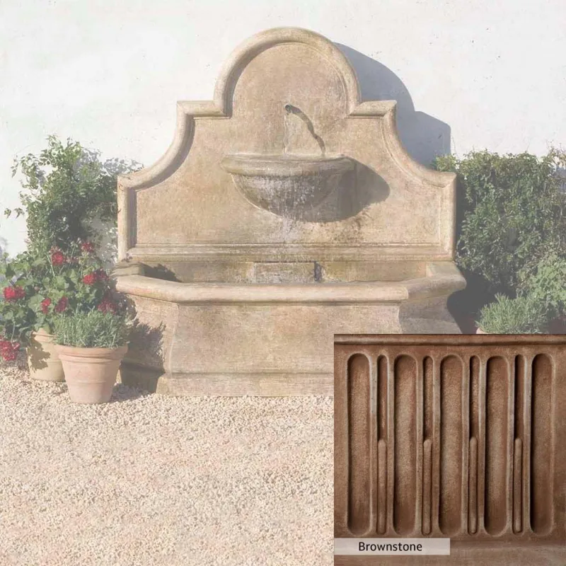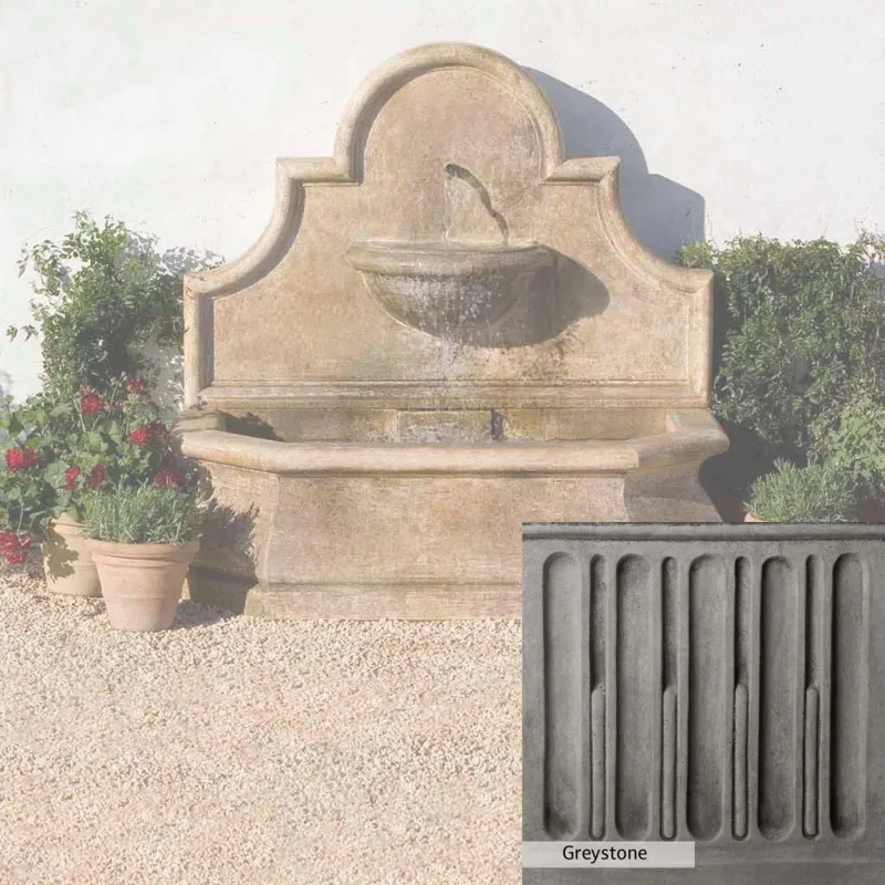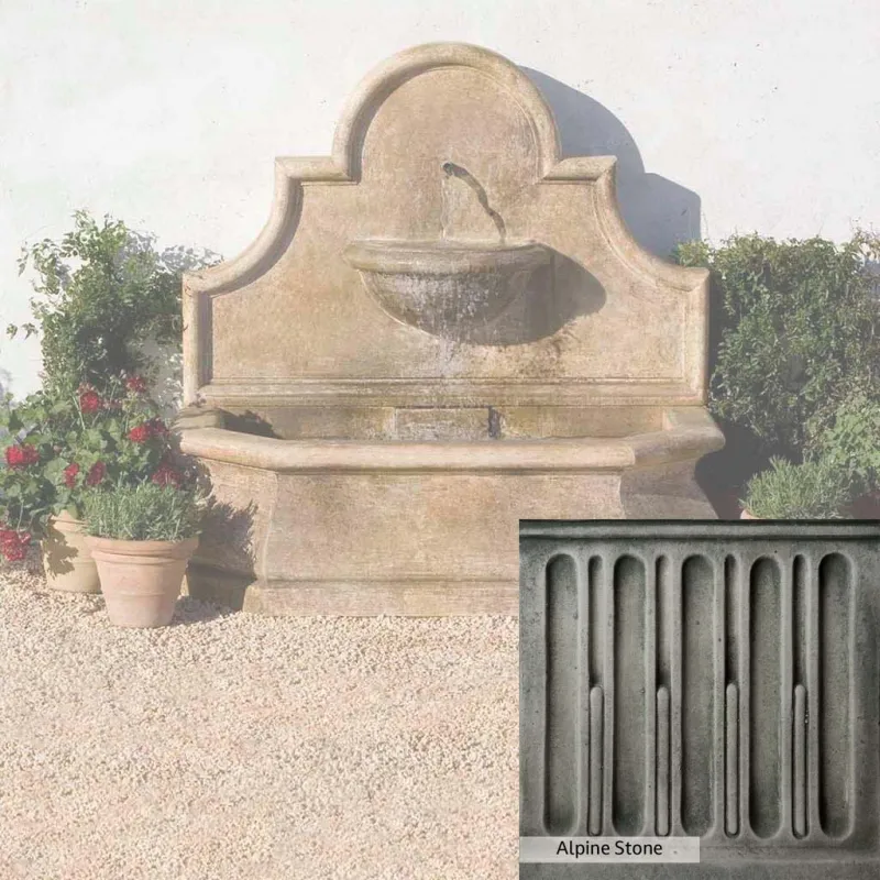 Skilled artisans in the USA handcraft the Andalusia Wall Fountain. The Campania team applies the unique patina using their experience, making each piece one-of-a-kind. This fountain is shown in the Aged Limestone color. Campania International’s unique cast stone blend is meticulously molded to create each piece used in the construction of this fountain. Due to the materials, manufacturing processes, and variations in photography conditions, natural differences can occur in size, weight, and color. The actual color may vary from the photo.