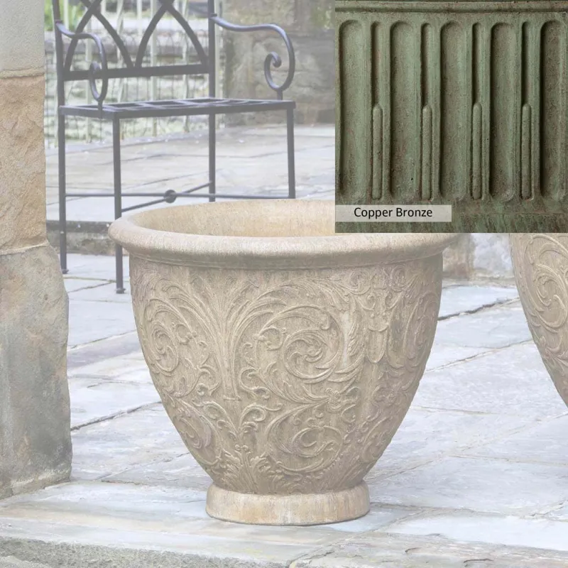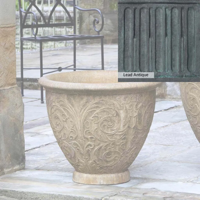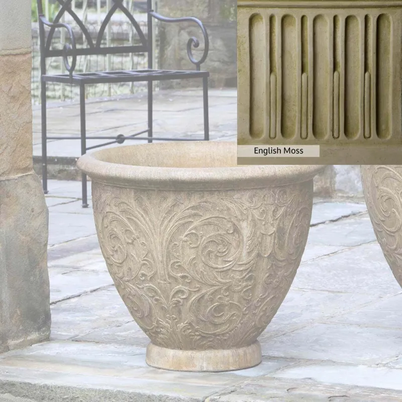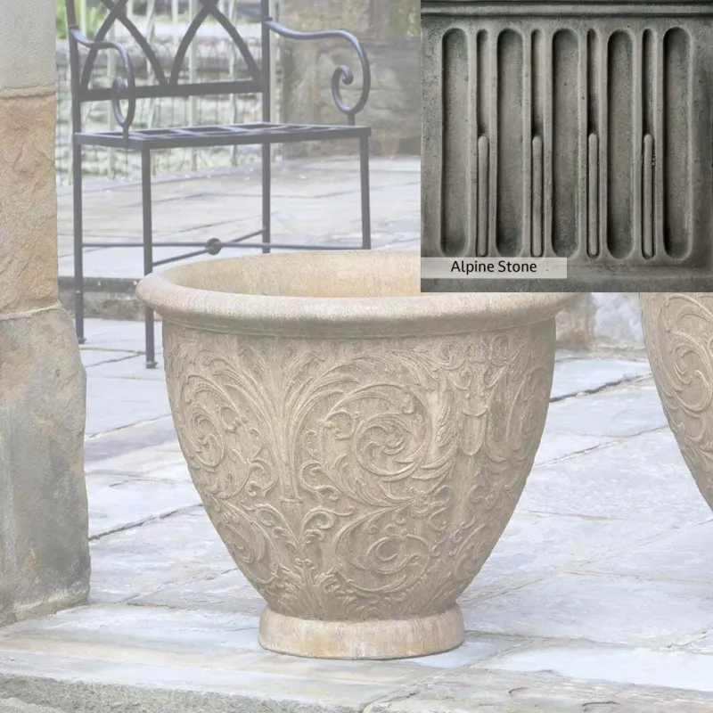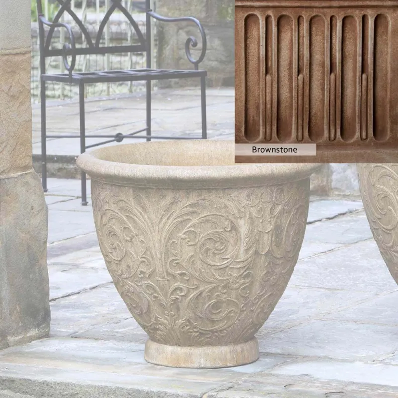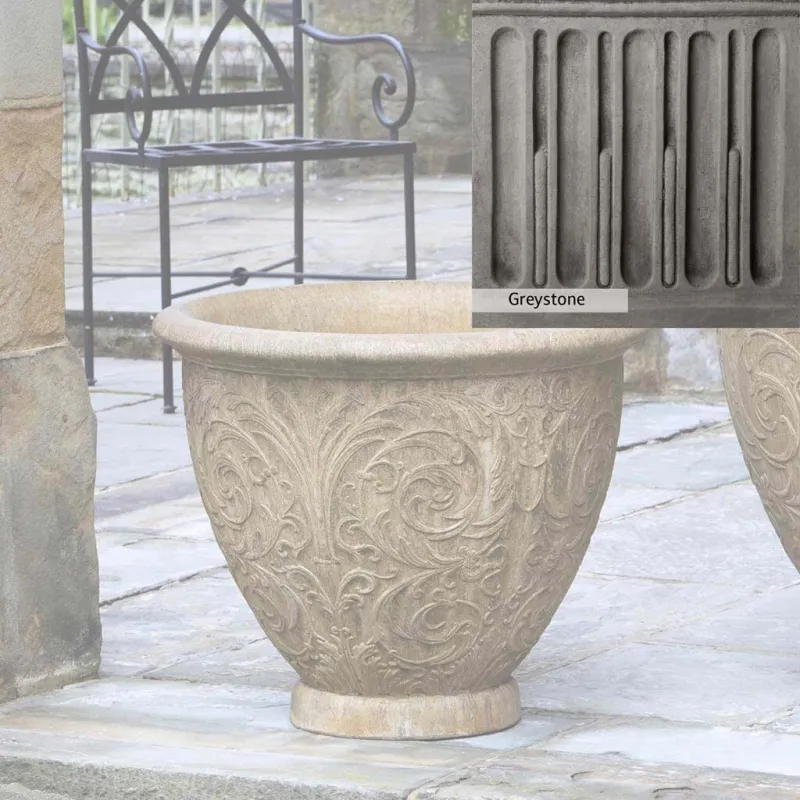 The Arabesque Medium Planter by Campania International adds charm and character to any space. Planters can be placed outdoors on a patio or the home office. Planters bring the garden to you, allowing for greenery to be placed in areas that might not grow a garden, like your front door stoop or a balcony garden. Using indoors, planters offer a home to indoor plants adding life and softness to your space. The Arabesque Medium Planter by Campania International is just the right piece, made of cast stone and hand-stained to order this planter offers a lifetime of enjoyment.