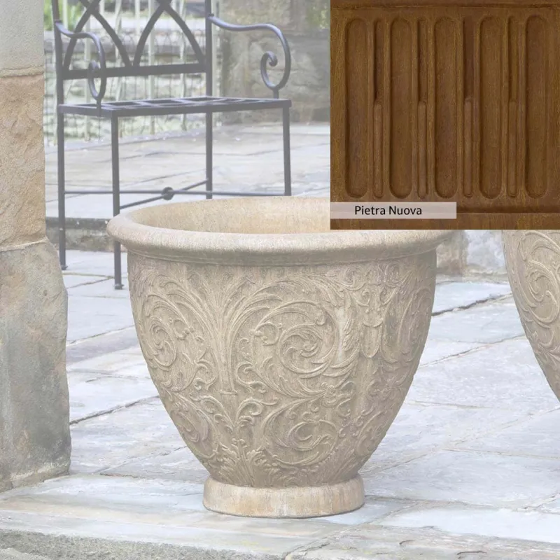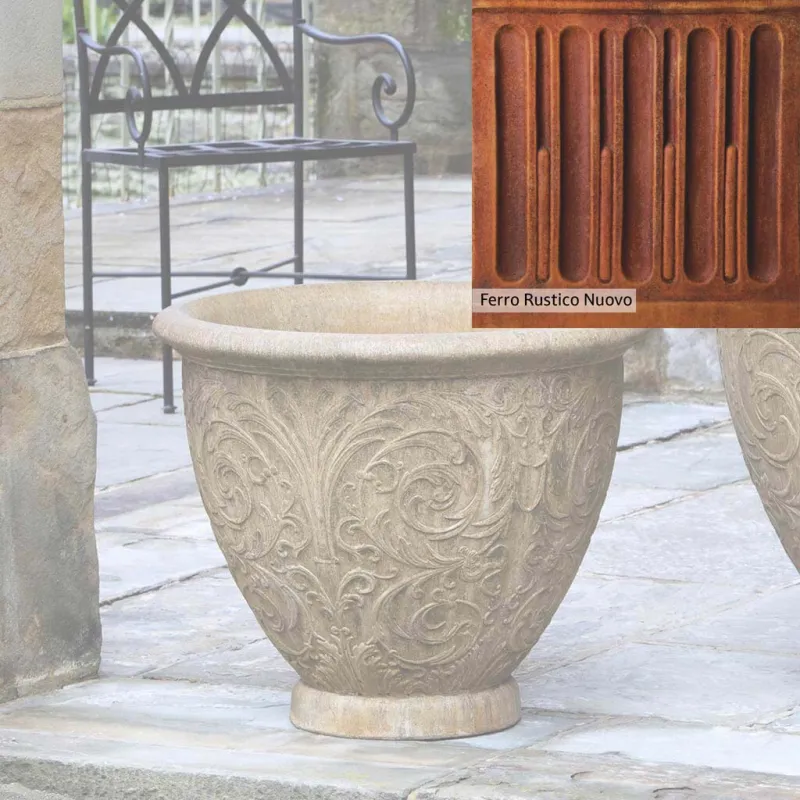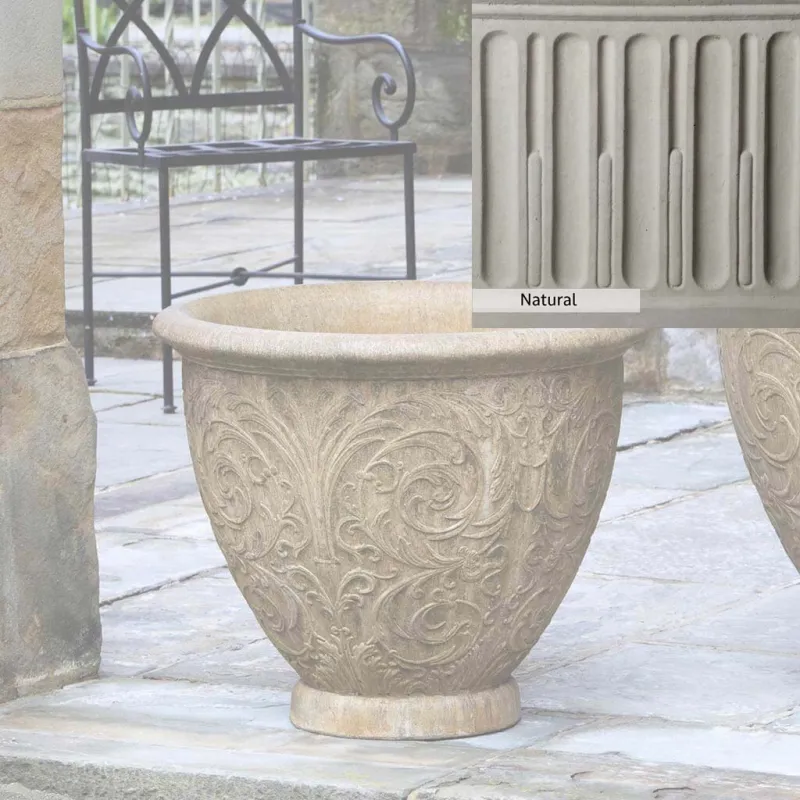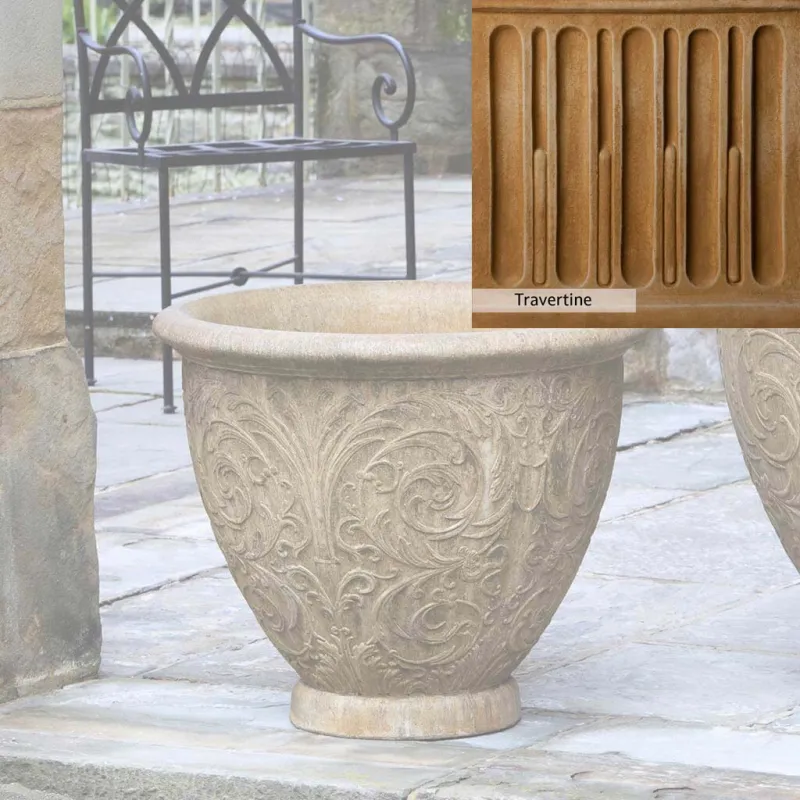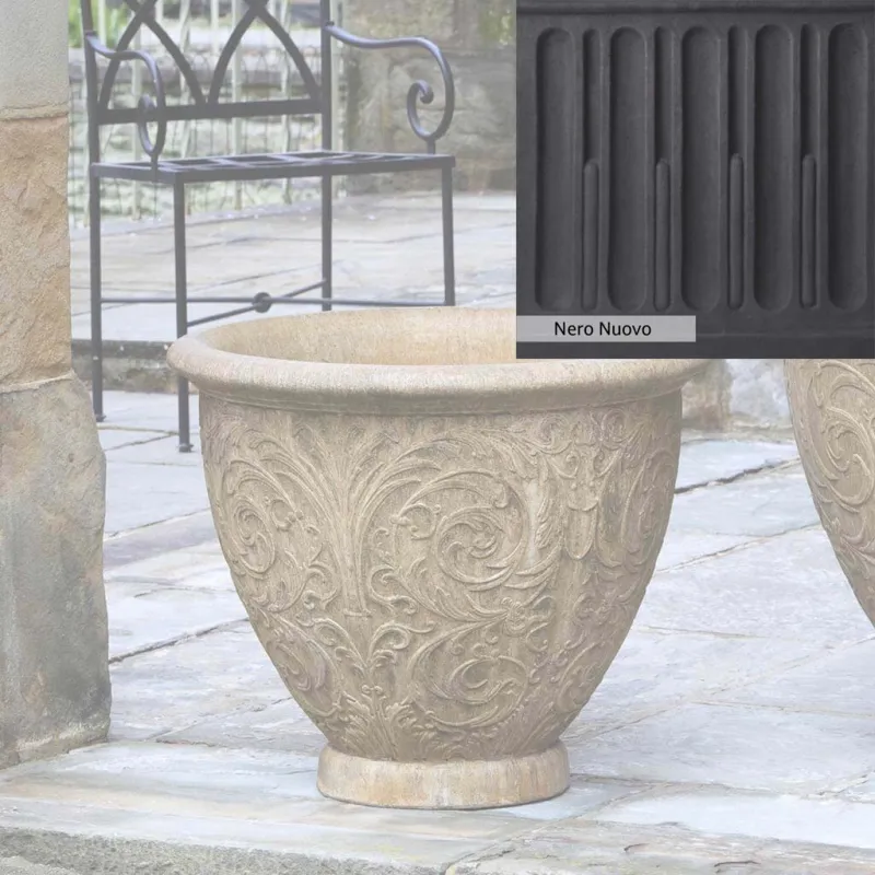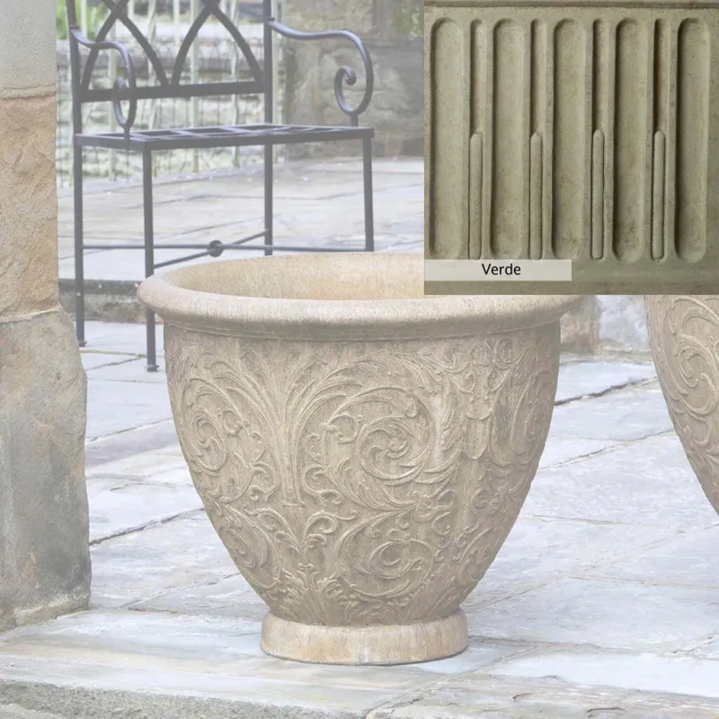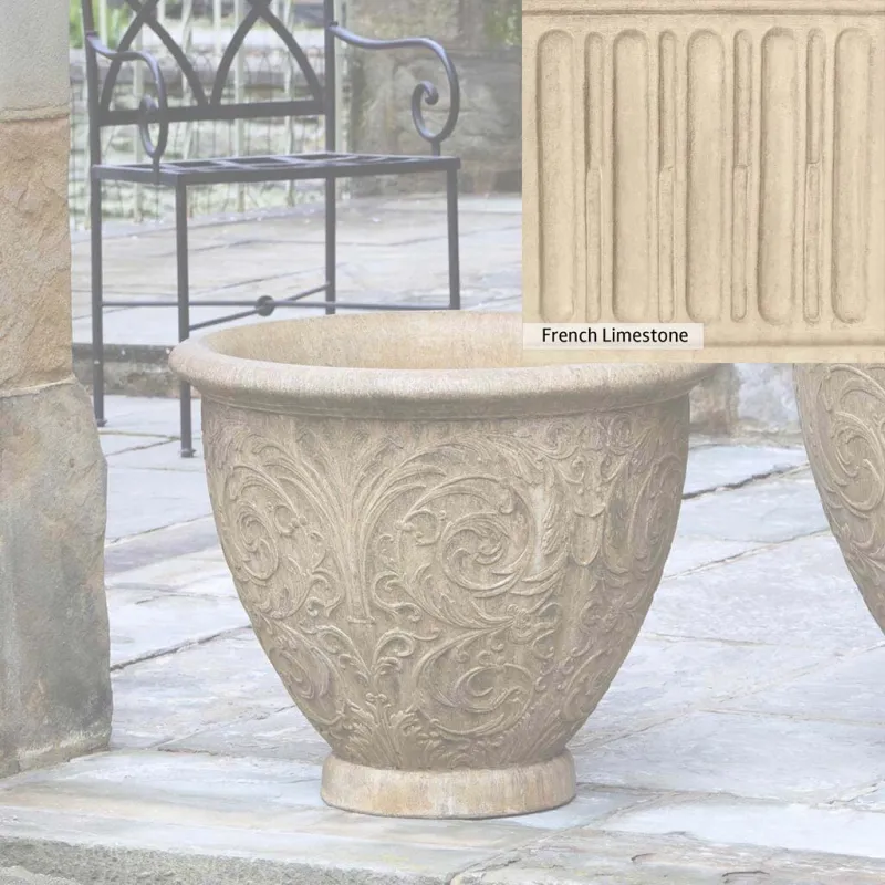 The Arabesque Medium Planter by Campania International adds charm and character to any space. Planters can be placed outdoors on a patio or the home office. Planters bring the garden to you, allowing for greenery to be placed in areas that might not grow a garden, like your front door stoop or a balcony garden. Using indoors, planters offer a home to indoor plants adding life and softness to your space. The Arabesque Medium Planter by Campania International is just the right piece, made of cast stone and hand-stained to order this planter offers a lifetime of enjoyment.