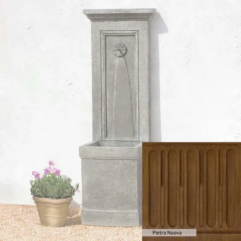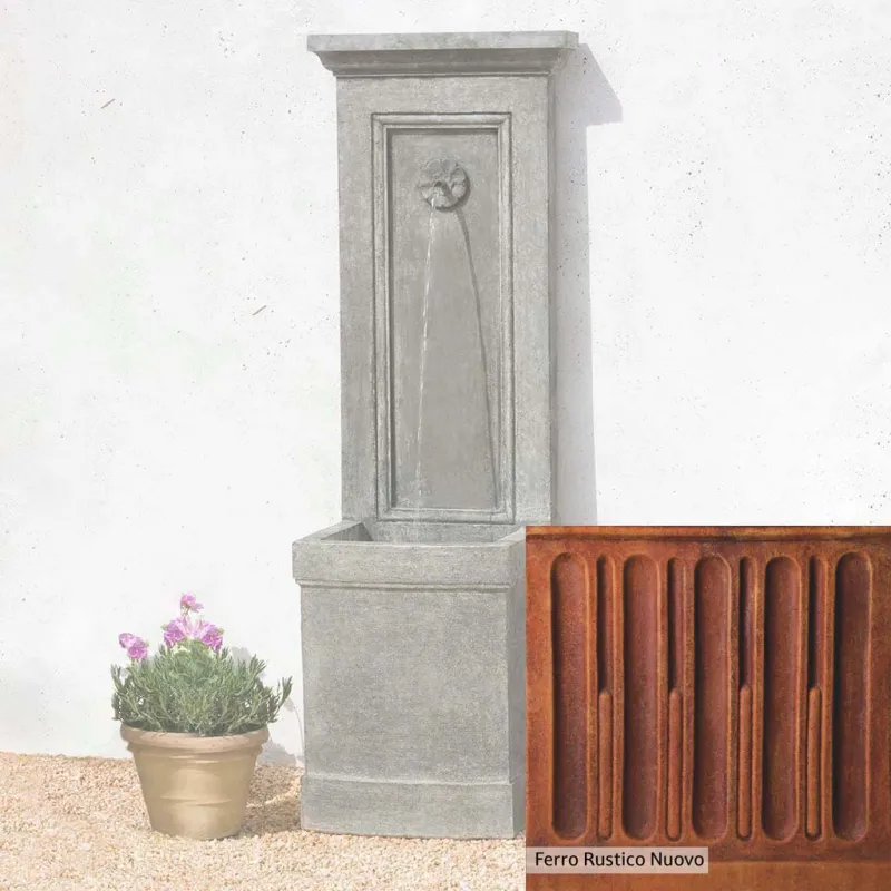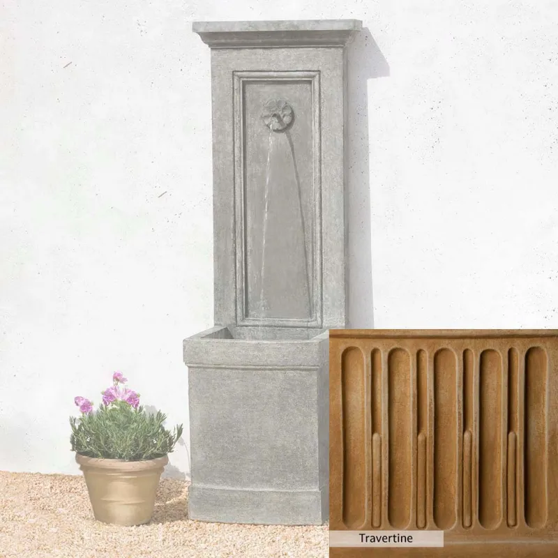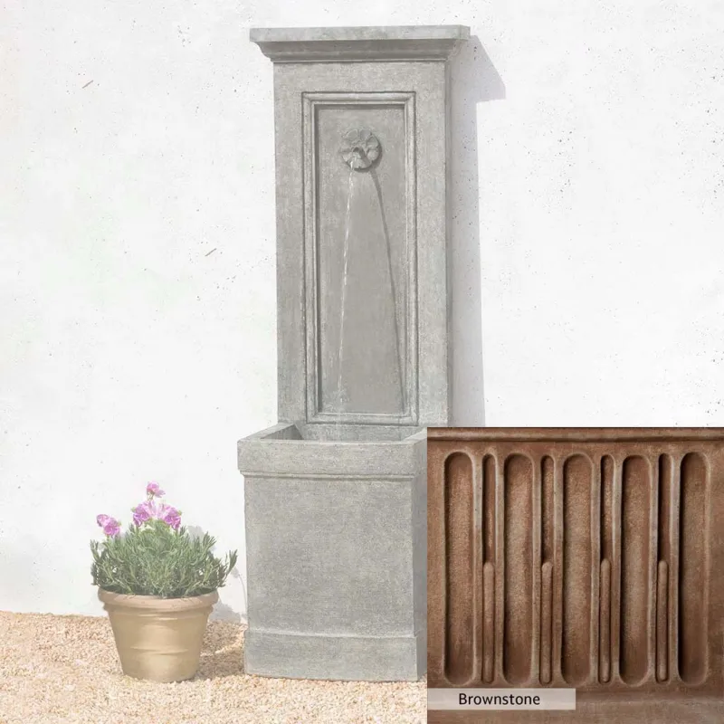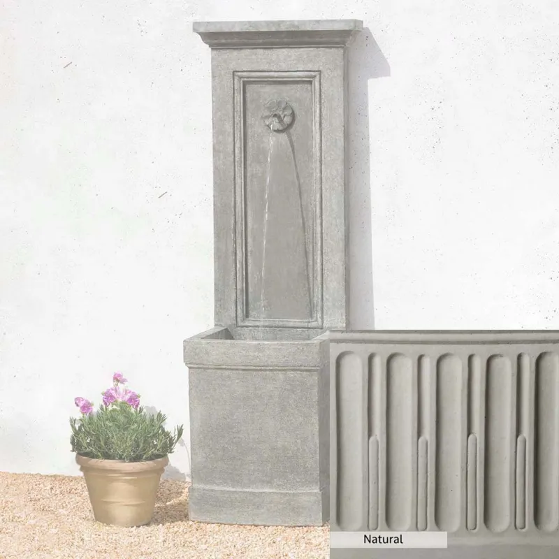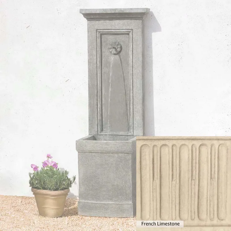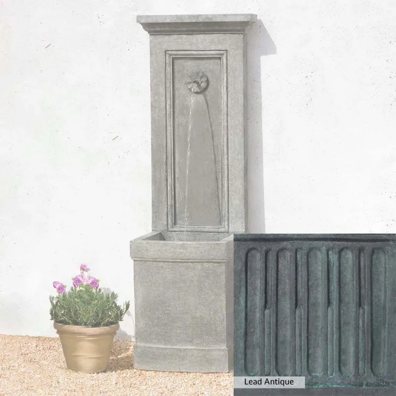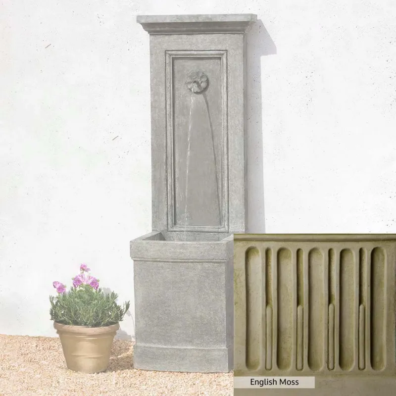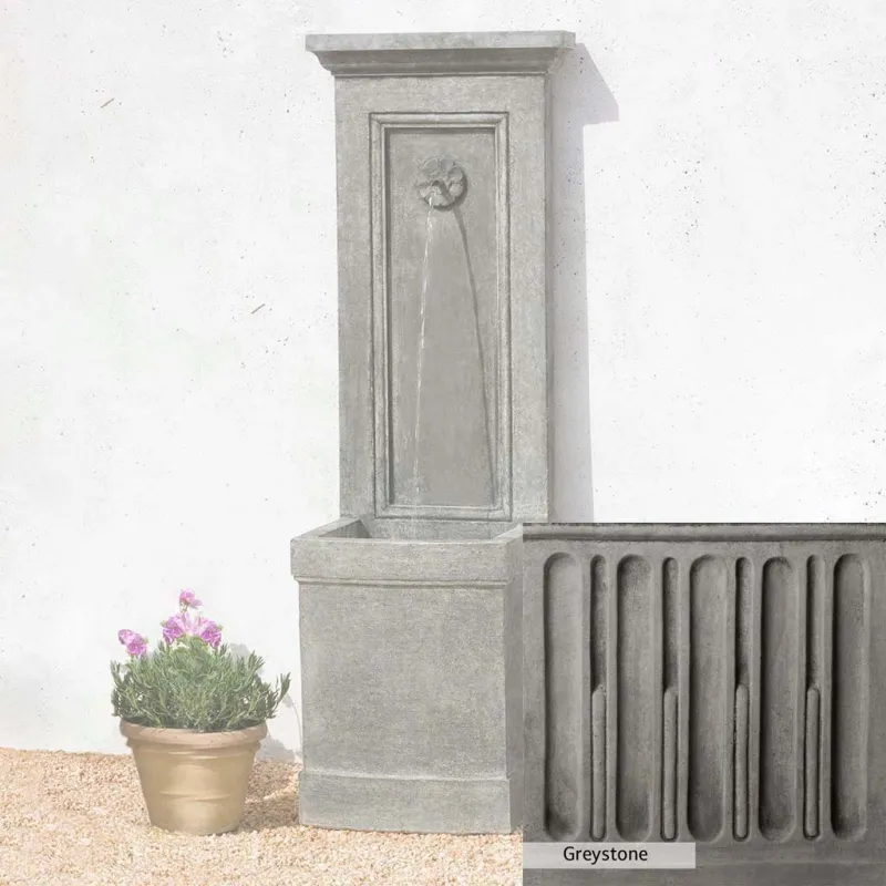 The Auberge Wall Fountain is handcrafted by skilled artisans in the USA. The Campania team applies a unique patina with experienced hands, making each piece special. This fountain is featured in the Alpine Stone color. Campania International’s exclusive cast stone blend is expertly molded to create each piece in the construction of this fountain. Due to the materials used and manufacturing processes, as well as variations in photography conditions, natural differences may occur in size, weight, and color. The actual color may vary from the photo.