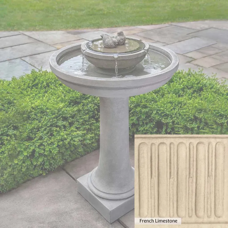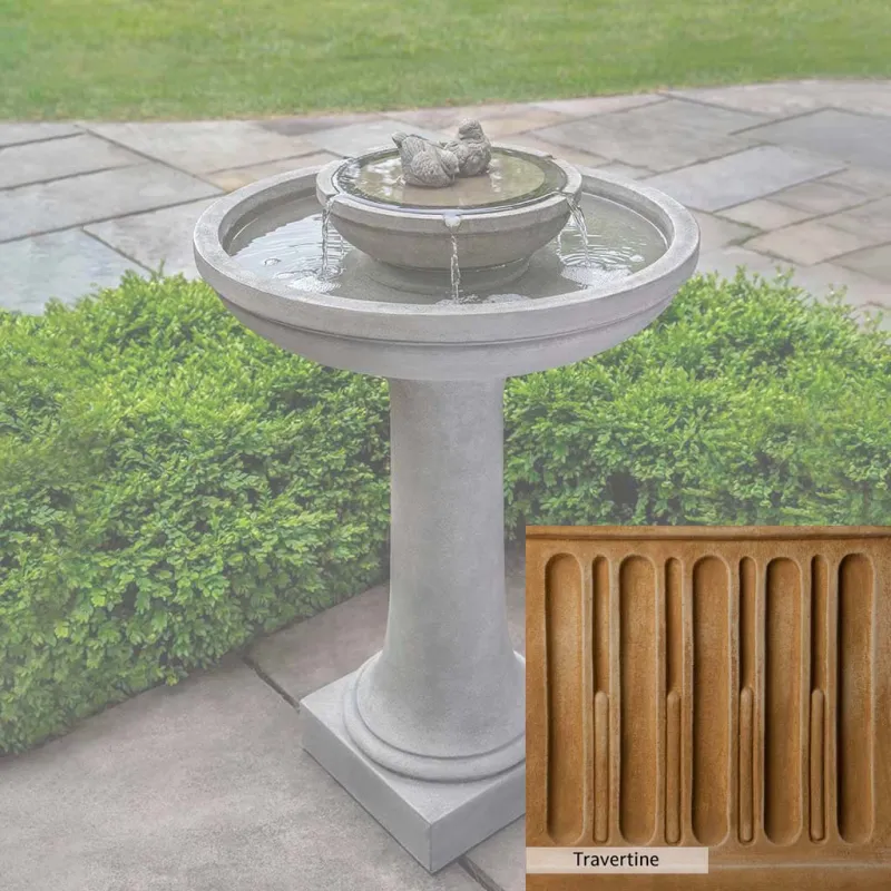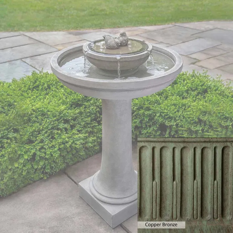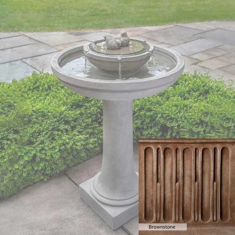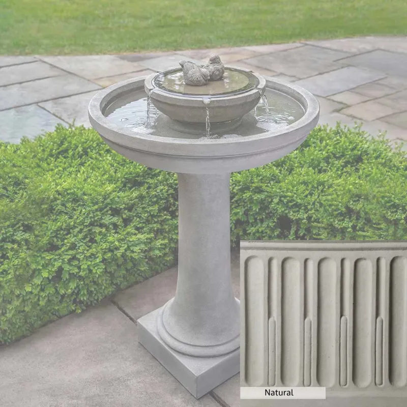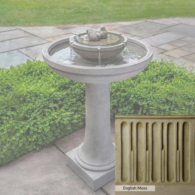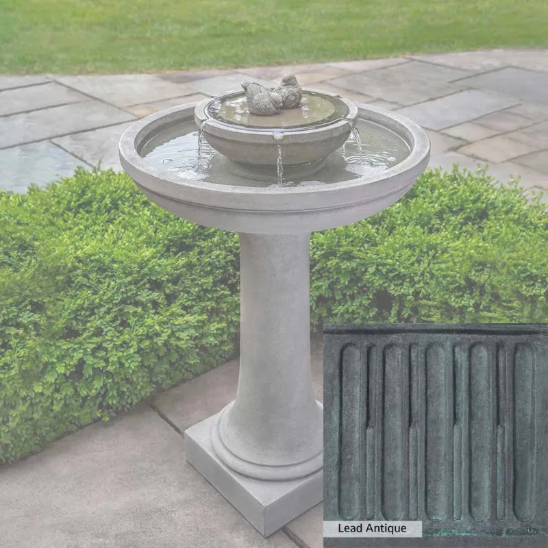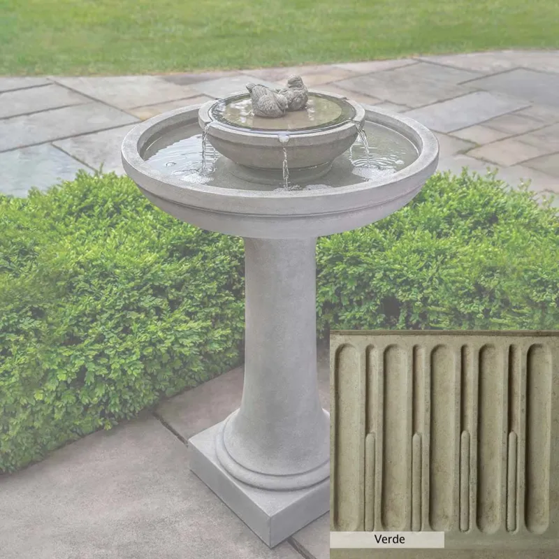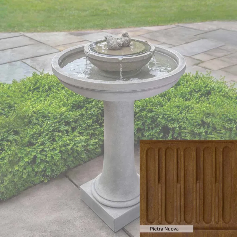 Skilled artisans in the USA handcraft the Dolce Nido Fountain. The Campania team applies the unique patina using their experience, making each piece one-of-a-kind. This fountain is shown in the Alpine Stone color. Campania International’s unique cast stone blend is meticulously molded to create each piece used in the construction of this fountain. Due to the materials, manufacturing processes, and variations in photography conditions, natural differences can occur in size, weight, and color. The actual color may vary from the photo.