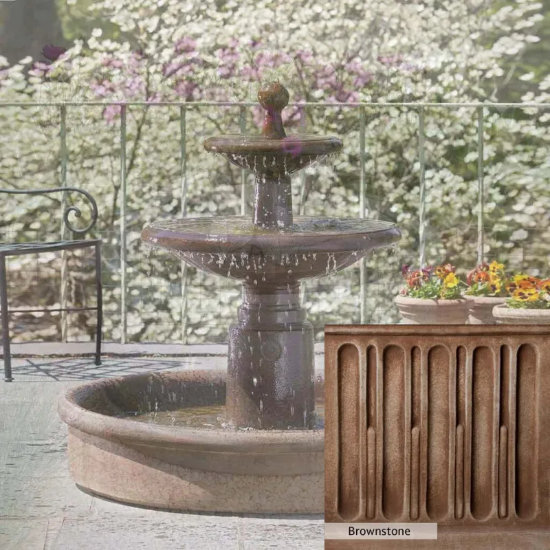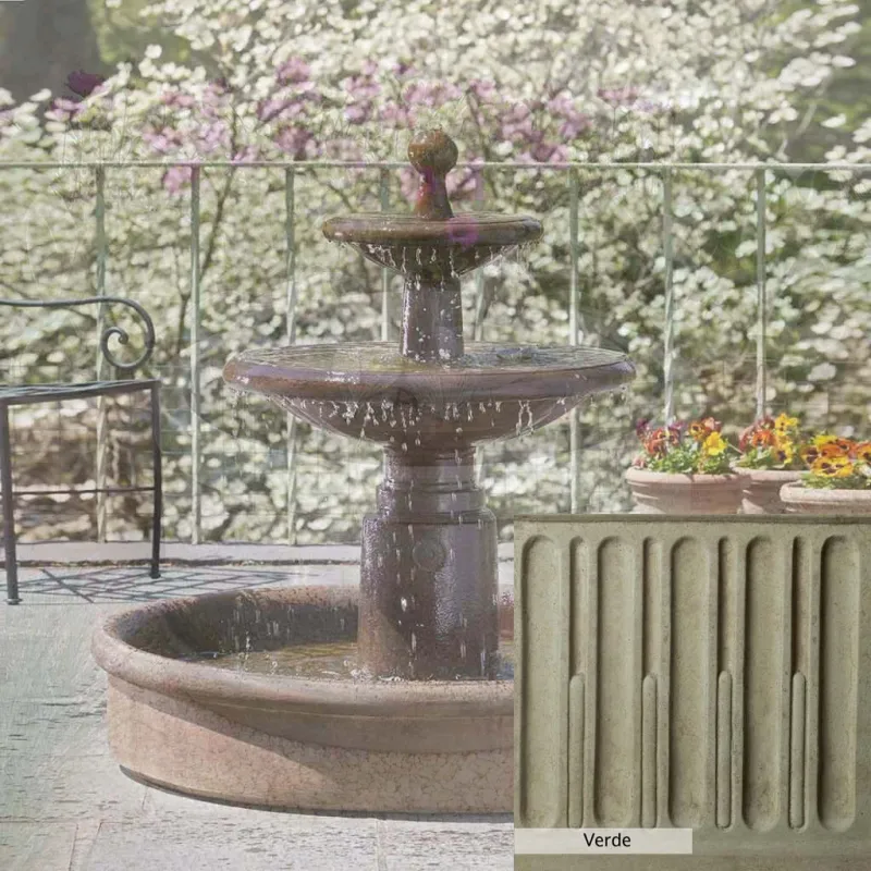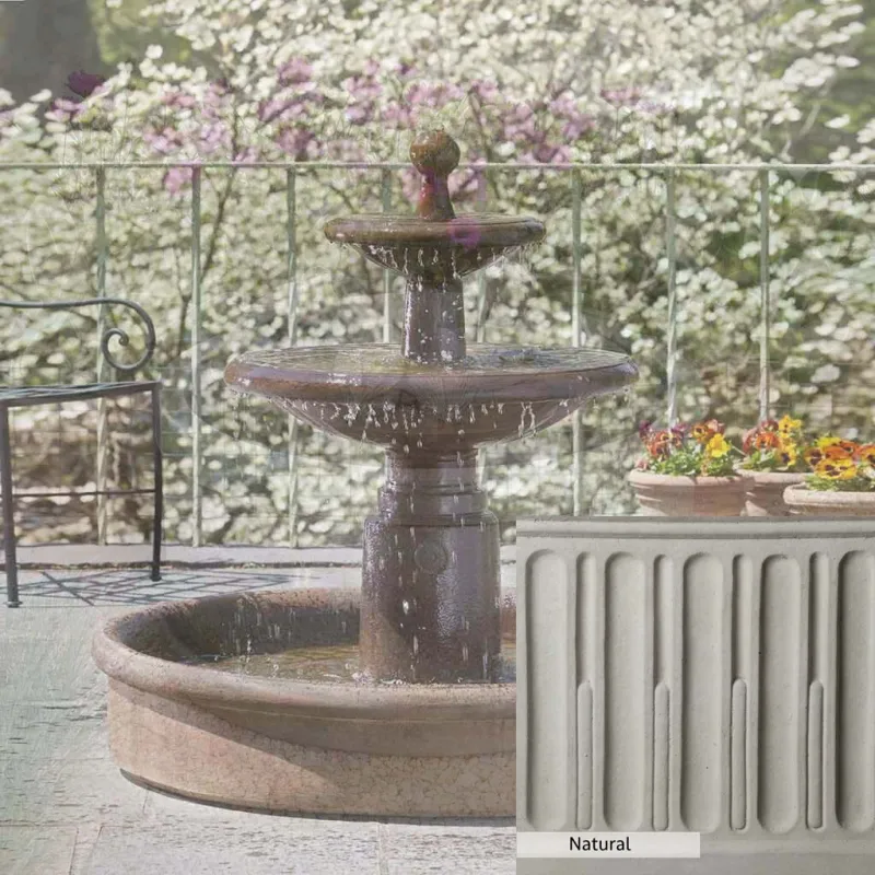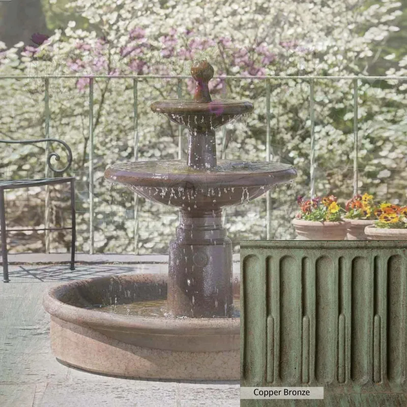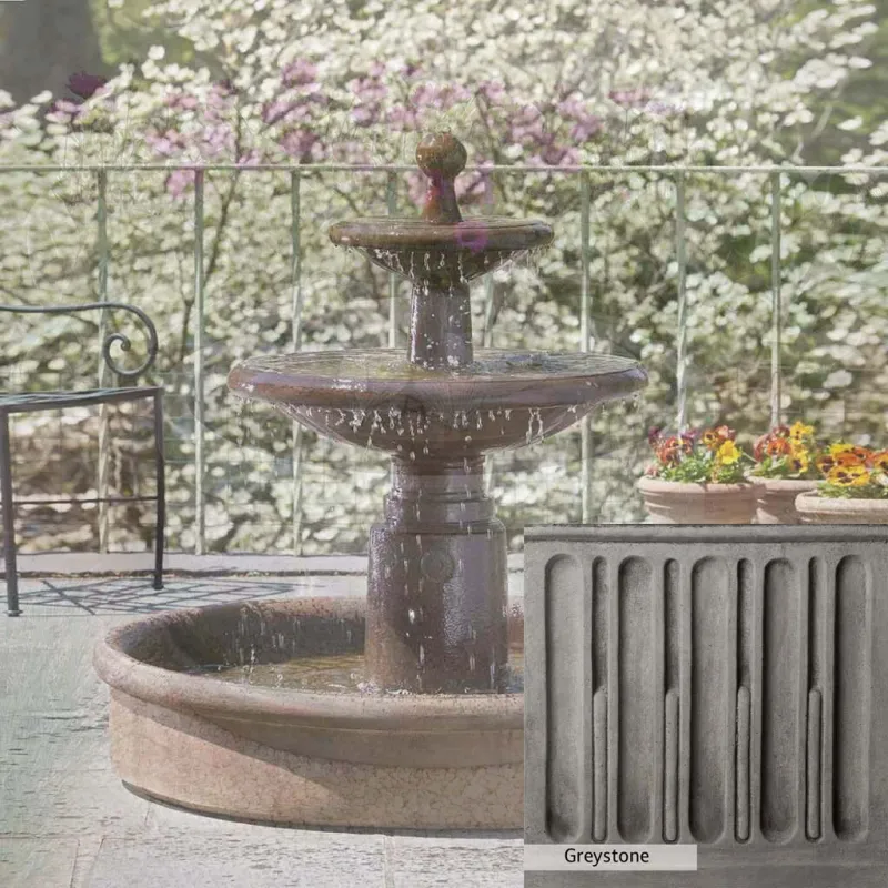 Skilled artisans in the USA handcraft the Esplanade Two Tier Fountain. With their extensive experience, the Campania team applies the unique patina, ensuring each piece is extraordinary. This fountain is shone in the Ferro Rustico Nuovocolor. Campania International’s proprietary cast stone blend is meticulously molded to create each piece used in the construction of this fountain. Due to the use of different materials and manufacturing processes, as well as varying photography conditions, natural variations in size, weight, and color can occur. The actual color may differ from the photo.