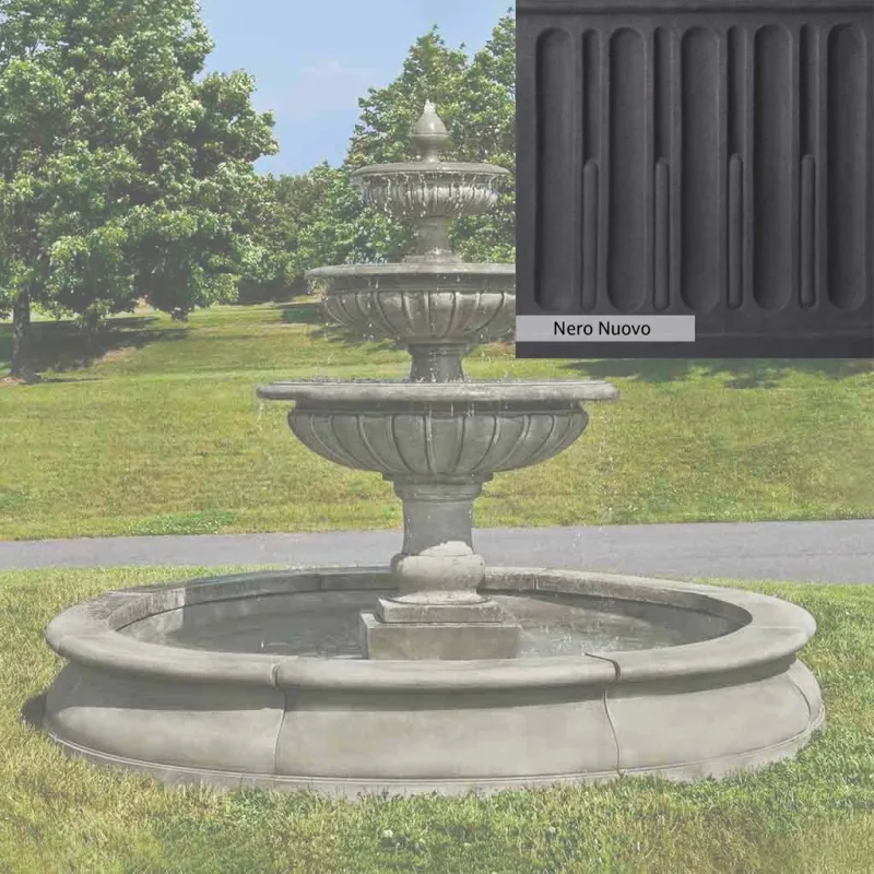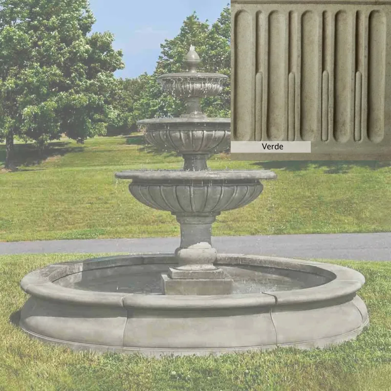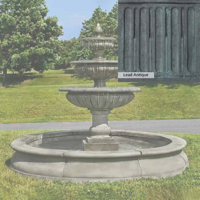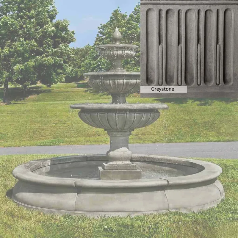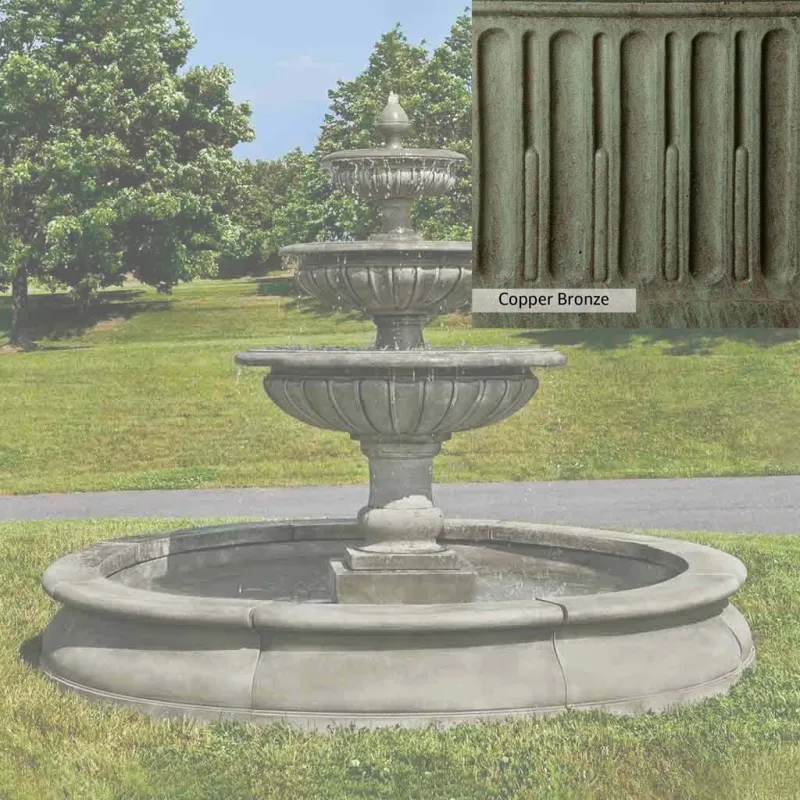 Skilled artisans in the USA handcraft the Estate Longvue Fountain. The Campania team applies a unique patina, making each piece one-of-a-kind. This fountain is shown in the Alpine Stone color. Due to materials, manufacturing processes, and variations in photography conditions, natural differences can occur in size, weight, and color. The actual color may vary from the photo.