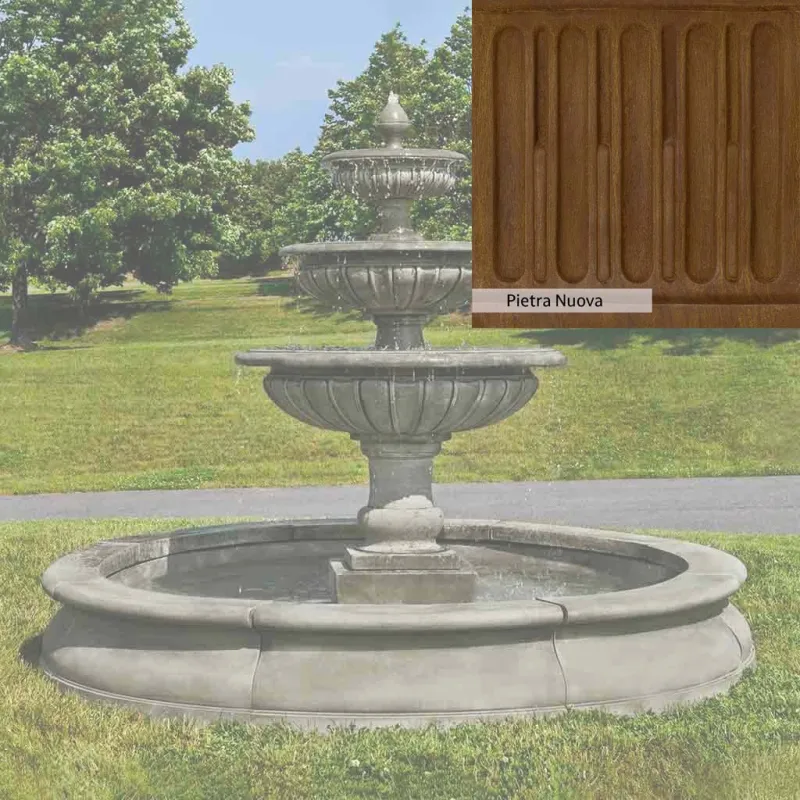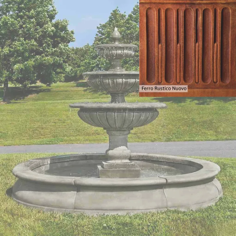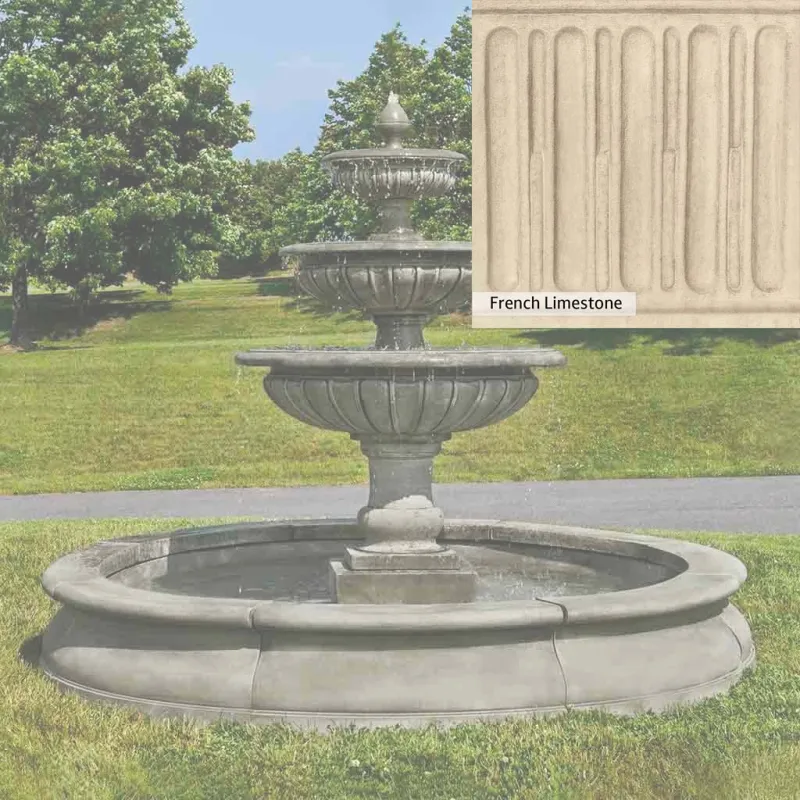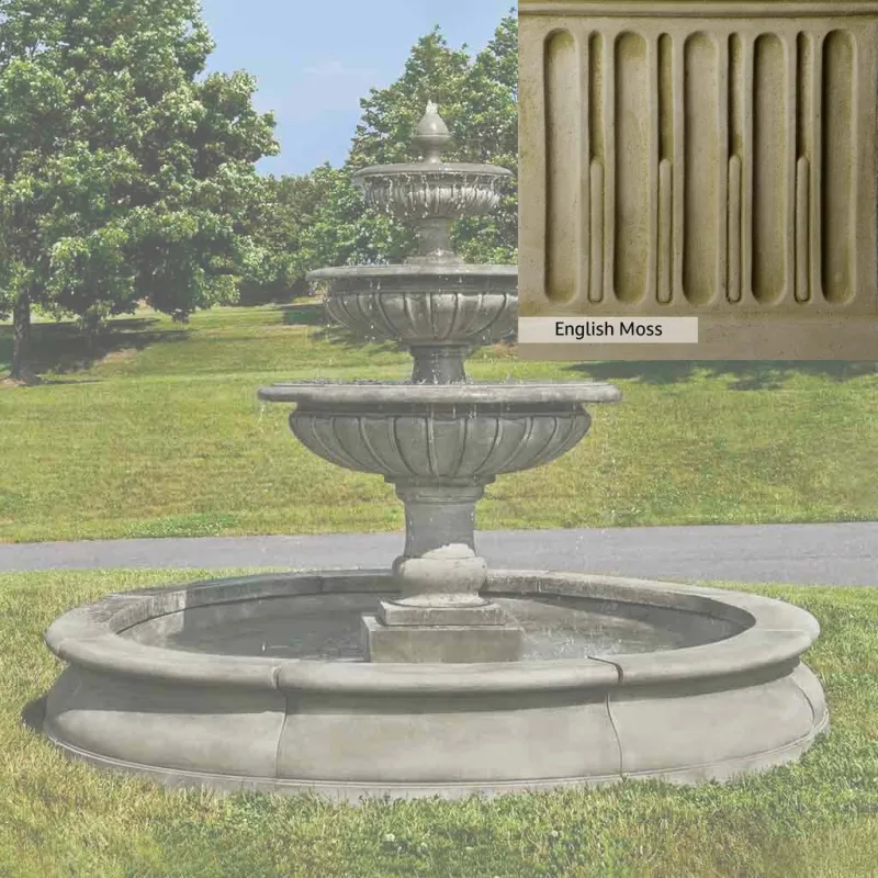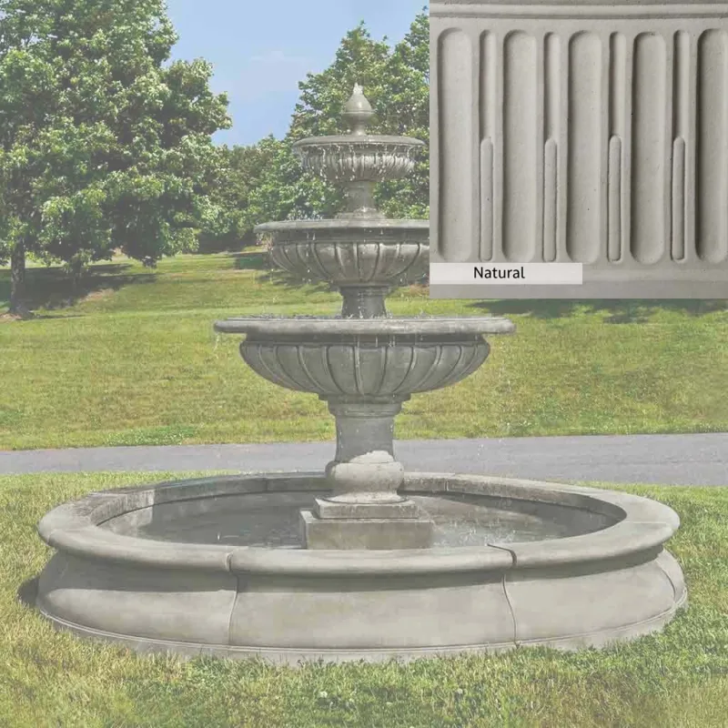 Skilled artisans in the USA handcraft the Estate Longvue Fountain. The Campania team applies a unique patina, making each piece one-of-a-kind. This fountain is shown in the Alpine Stone color. Due to materials, manufacturing processes, and variations in photography conditions, natural differences can occur in size, weight, and color. The actual color may vary from the photo.