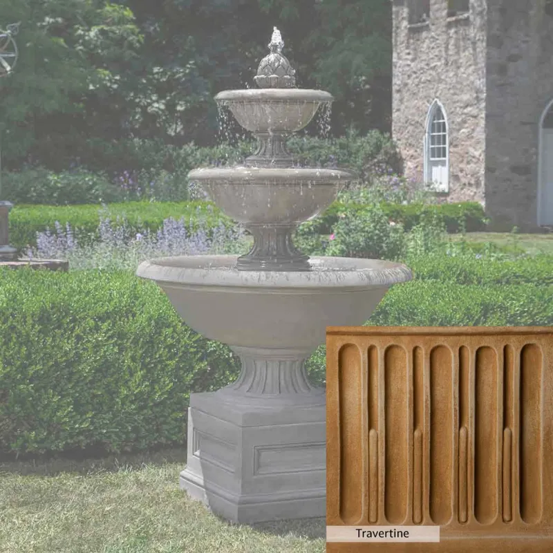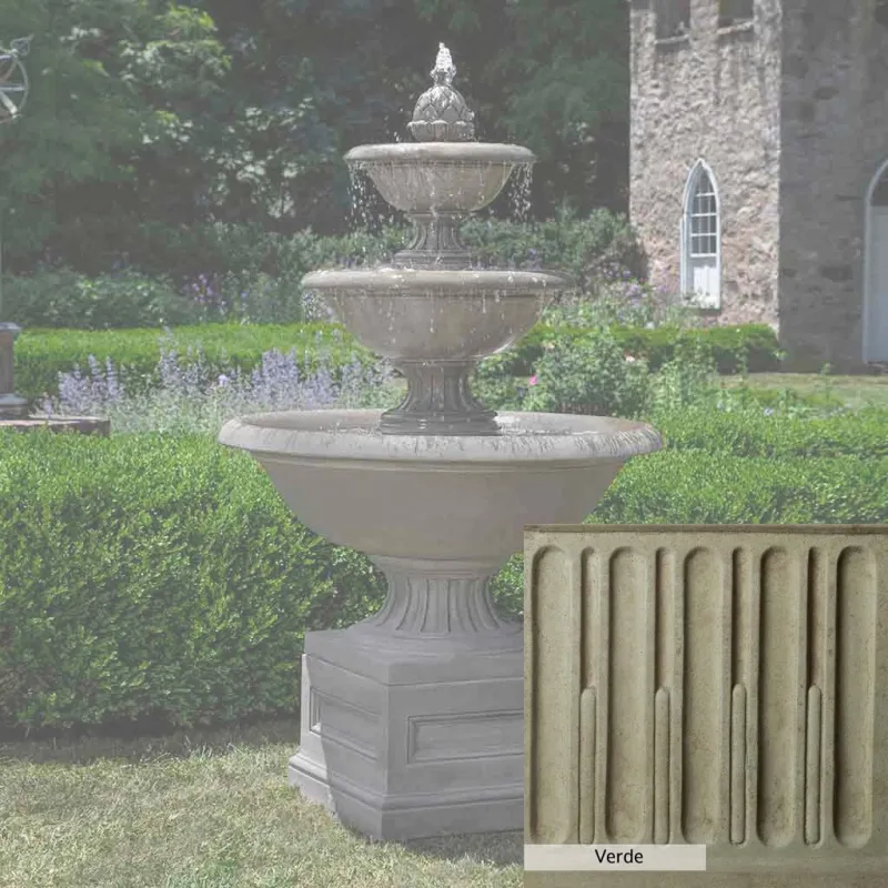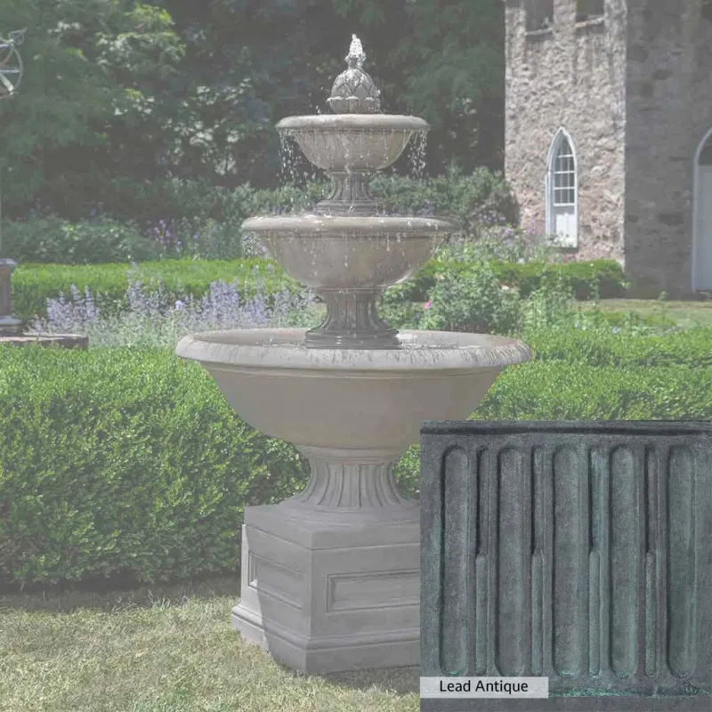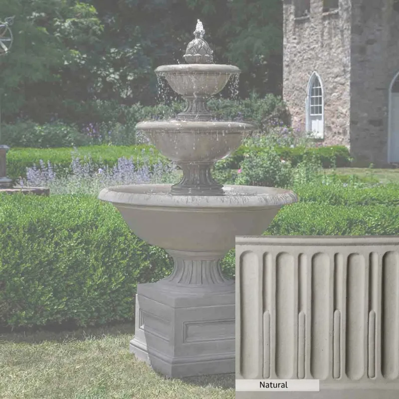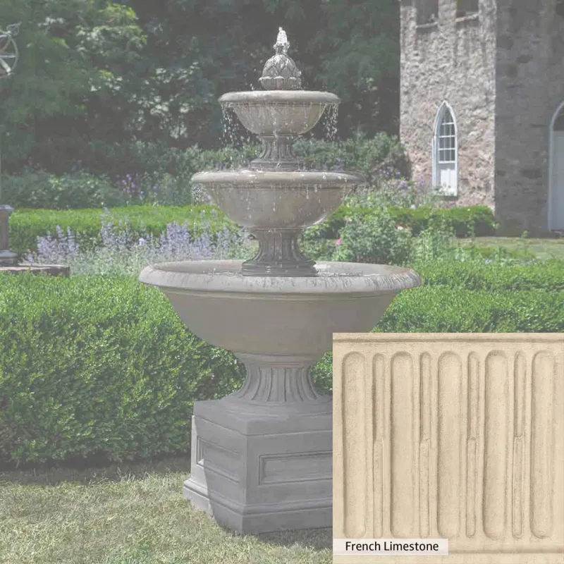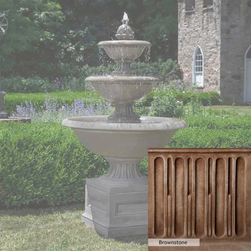 Skilled artisans in the USA handcraft the Fonthill Fountain. The Campania team applies the unique patina using their experience, making each piece one-of-a-kind. This fountain is shown in the Alpine Stone color. Campania International’s unique cast stone blend is meticulously molded to create each piece used in the construction of this fountain. Due to the materials, manufacturing processes, and variations in photography conditions, natural differences can occur in size, weight, and color. The actual color may vary from the photo.