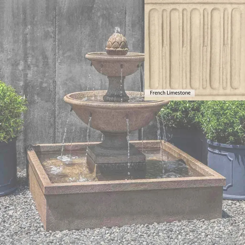 Skilled artisans in the USA handcraft the La Mirande Fountain. The Campania team applies a unique patina, making each piece one-of-a-kind. This fountain is shown in the Aged Limestone color. Due to materials, manufacturing processes, and variations in photography conditions, natural differences can occur in size, weight, and color. The actual color may vary from the photo.