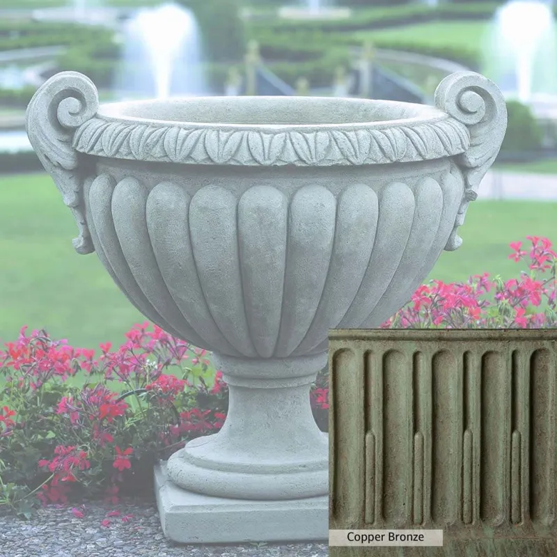 The Longwood Volute Handle Urn by Campania International adds charm and character to any space. Planters can be placed outdoors on a patio or the home office, adding a planter with plants brings balance to your home design. Planters bring the garden to you, allowing for greenery to be placed in areas that might not grow a garden, like your front door stoop or a balcony garden. Outdoor planters are a beautiful element that can frame an area or draw the eye to a special garden place. While used indoors, planters offer a home to indoor plants adding life and softness to your space. The Longwood Volute Handle Urn by Campania International is just the right piece, made of cast stone and hand-stained to order. This planter urn offers a lifetime of enjoyment.