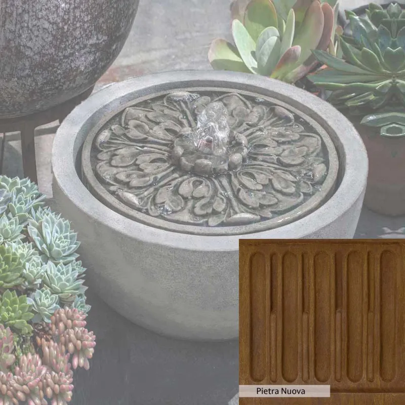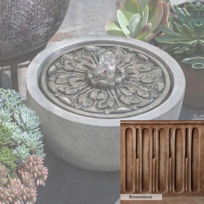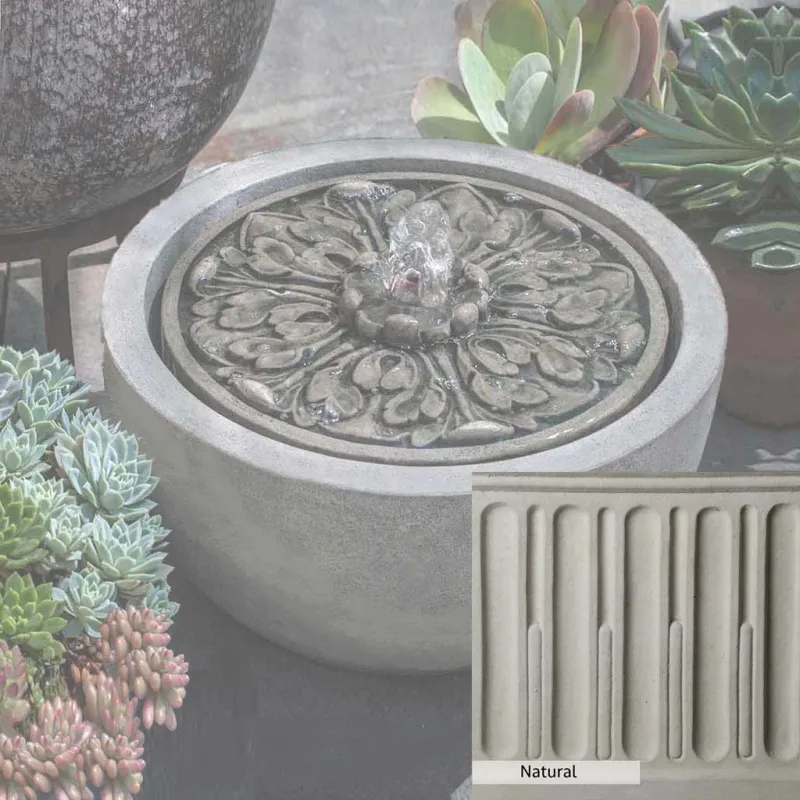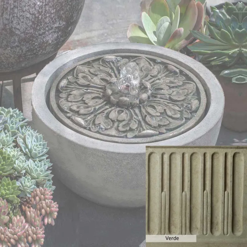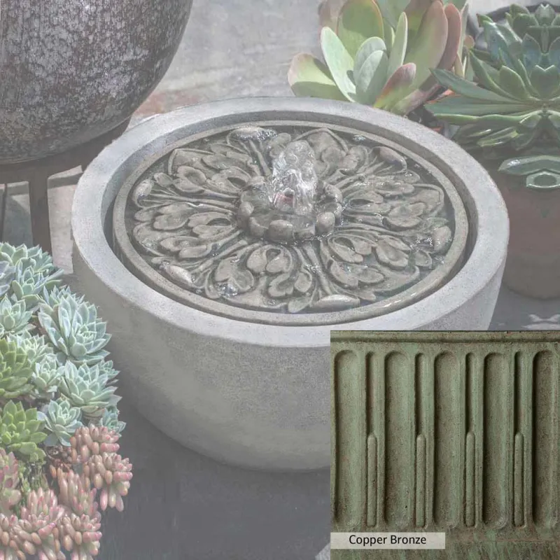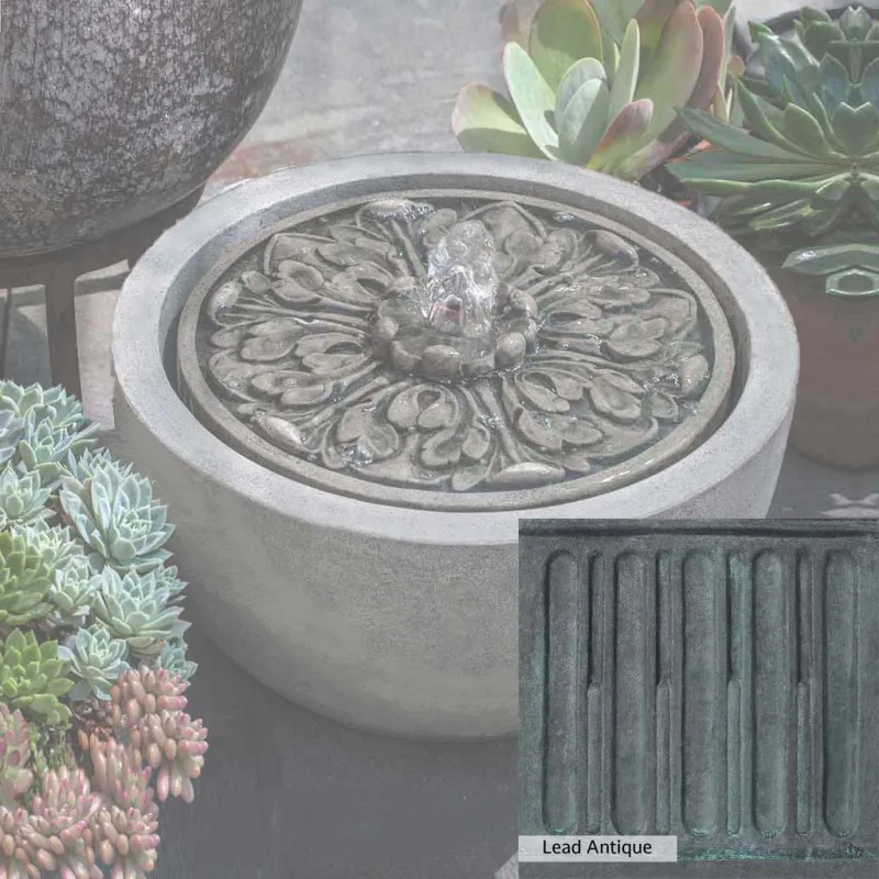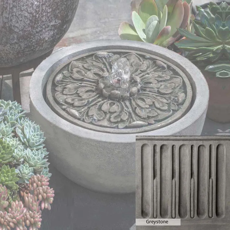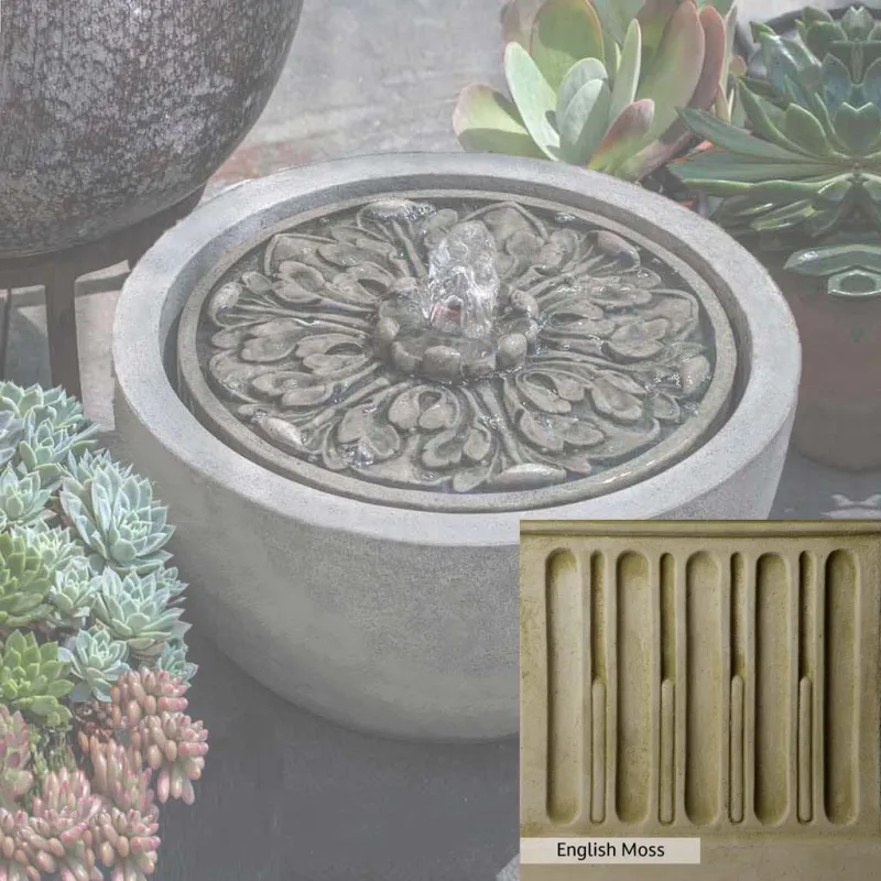 Skilled artisans in the USA handcraft the M-Series Medallion Fountain. The Campania team applies a unique patina, making each piece one-of-a-kind. This fountain is shown in the Alpine Stone color. Due to materials, manufacturing processes, and variations in photography conditions, natural differences can occur in size, weight, and color. The actual color may vary from the photo.