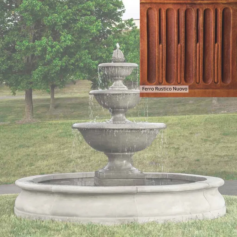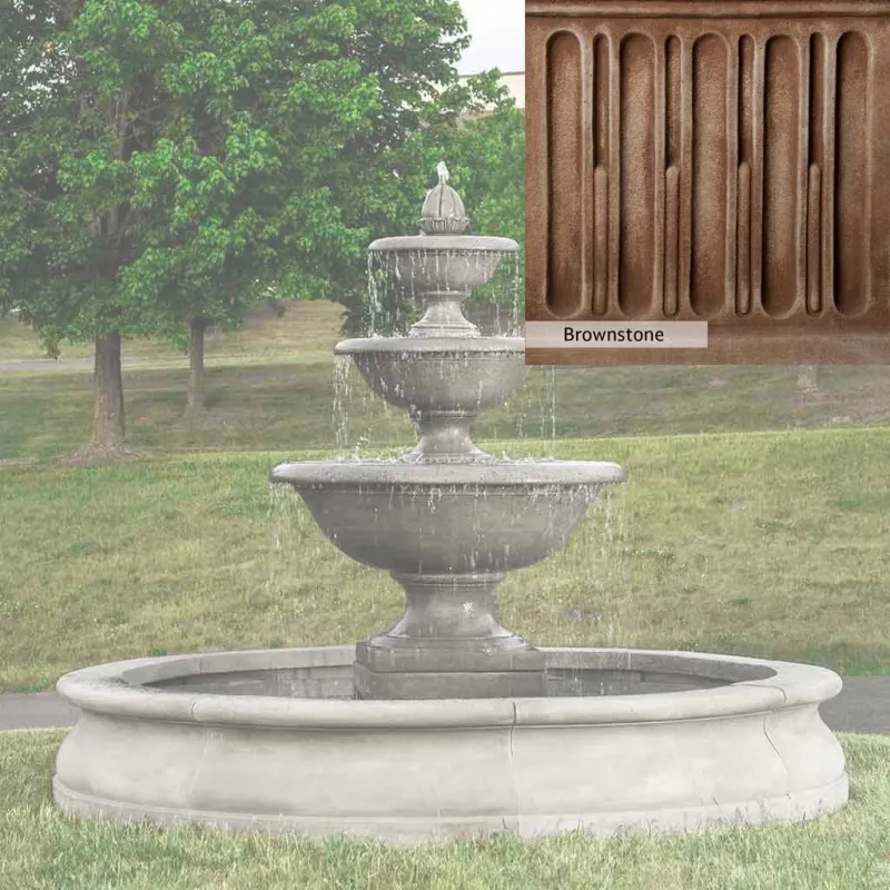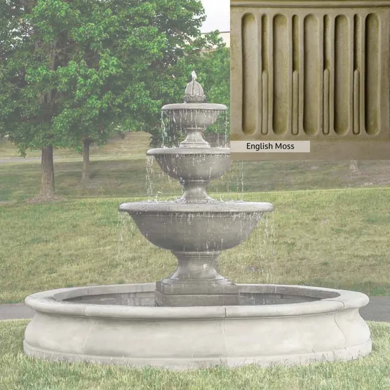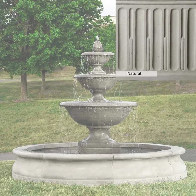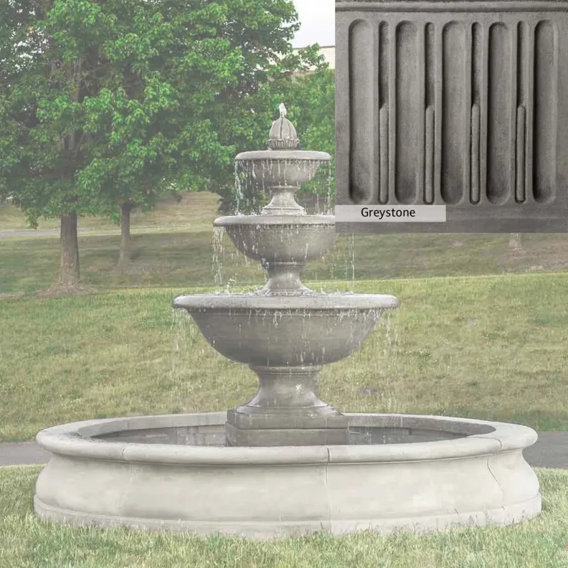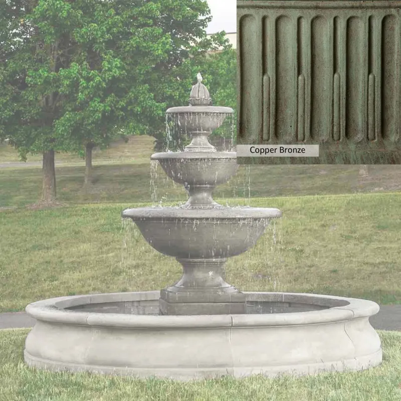 The Monteros Fountain in Basin is handcrafted by skilled artisans in the USA. The Campania team applies a unique patina with experienced hands, making each piece special. This fountain is featured in the color. Campania International’s exclusive cast stone blend is expertly molded to create each piece in the construction of this fountain. Due to the materials used and manufacturing processes, as well as variations in photography conditions, natural differences may occur in size, weight, and color. The actual color may vary from the photo.