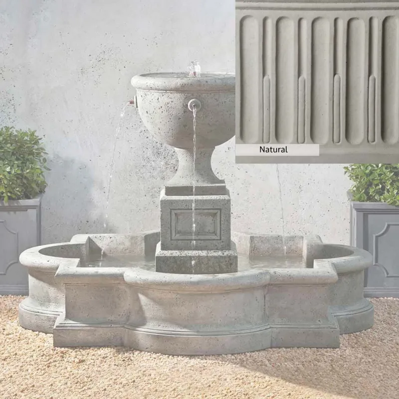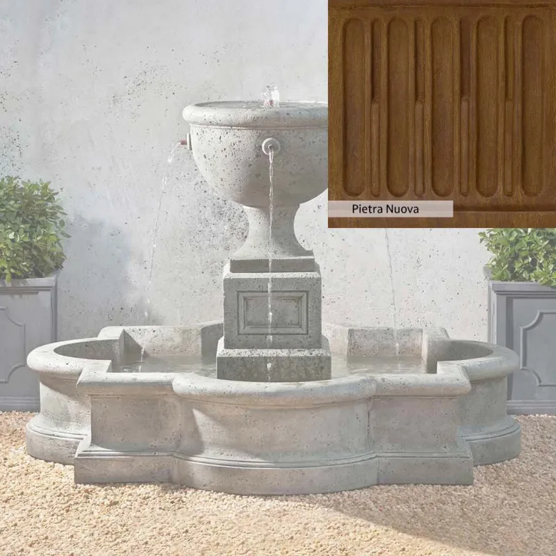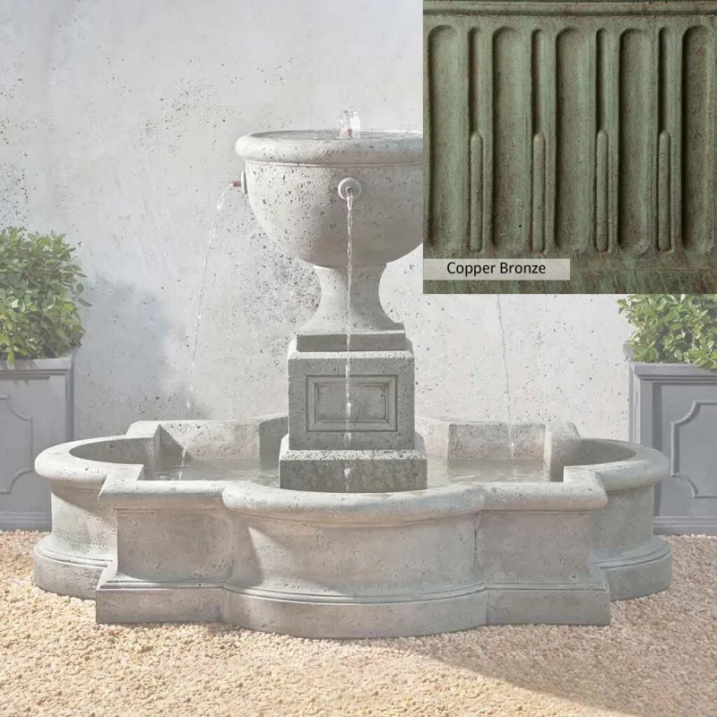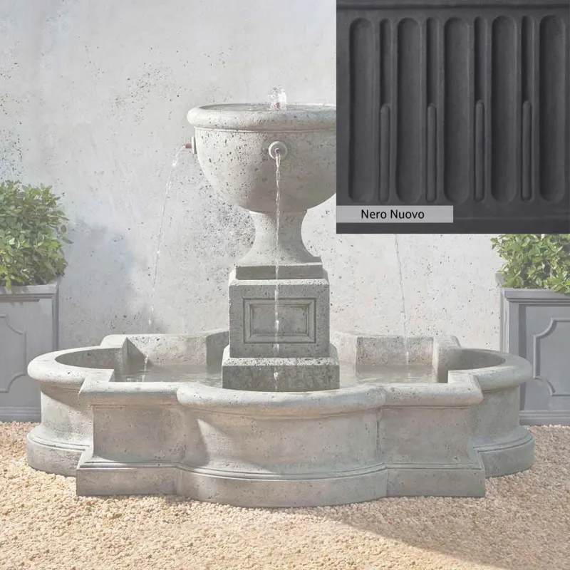 The Navonna Fountain is handcrafted by skilled artisans in the USA. With their extensive experience, the Campania team applies a unique patina to ensure that each piece is special. This fountain is shown in the Alpine Stone color. Campania International’s proprietary cast stone blend is meticulously molded to create each piece used in the construction of this fountain. Due to the use of different materials and manufacturing processes, as well as varying photography conditions, natural variations in size, weight, and color can occur. The actual color may differ from the photo.