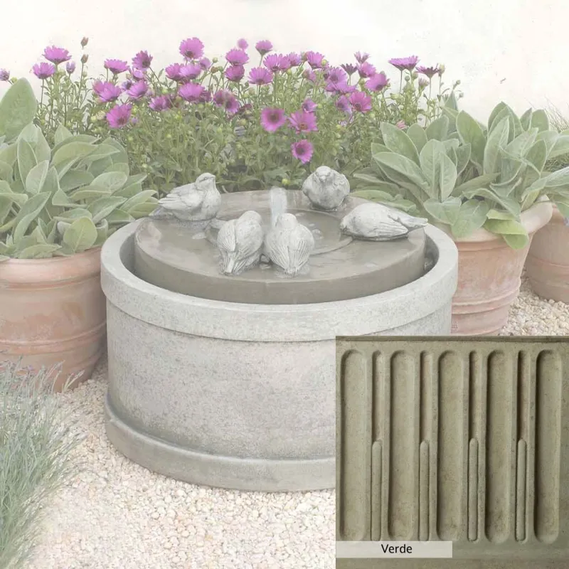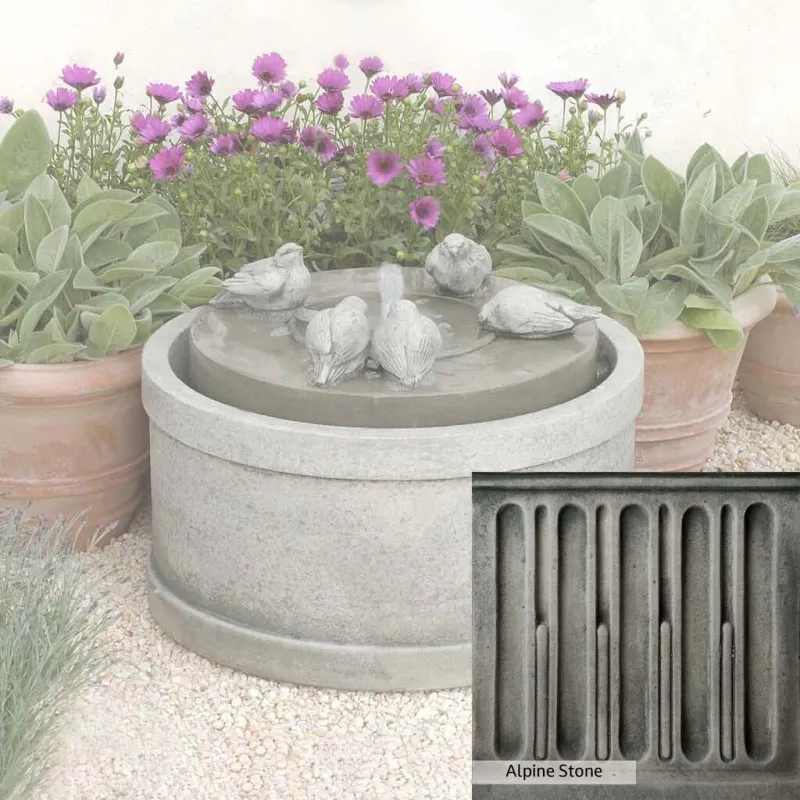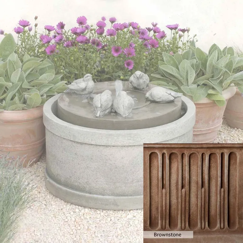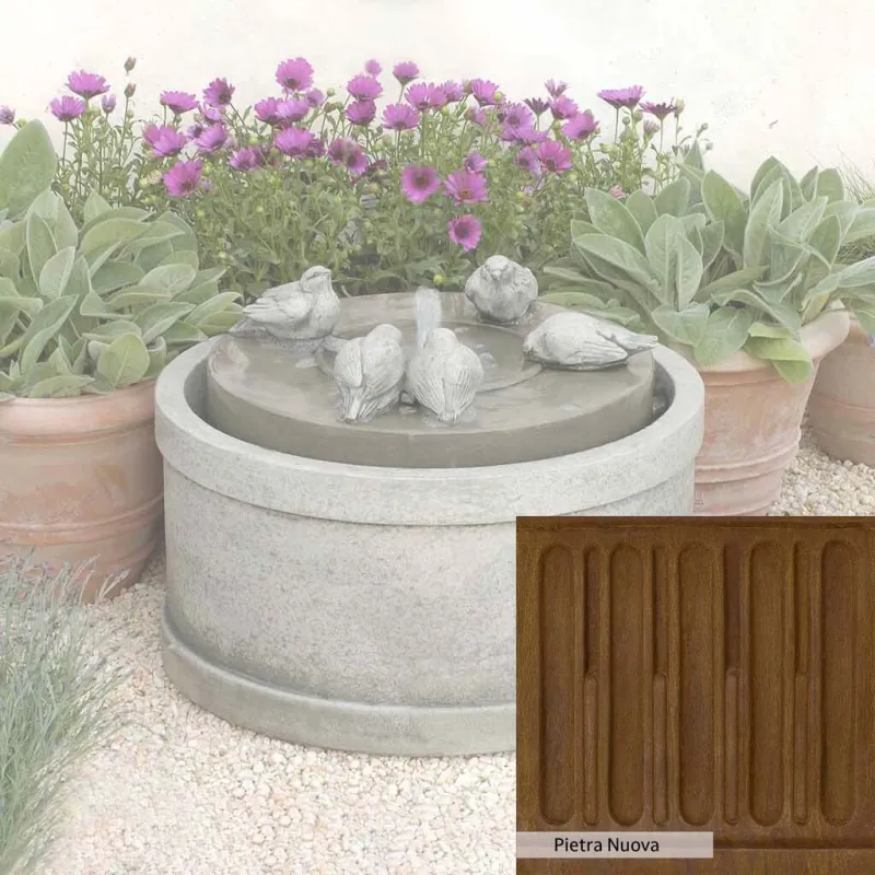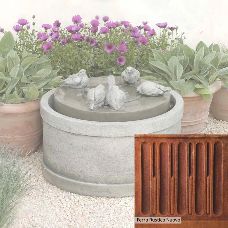 Skilled artisans in the USA handcraft the Passaros Fountain. The Campania team applies a unique patina, making each piece one-of-a-kind. This fountain is shown in the Greystone color. Due to materials, manufacturing processes, and variations in photography conditions, natural differences can occur in size, weight, and color. The actual color may vary from the photo.