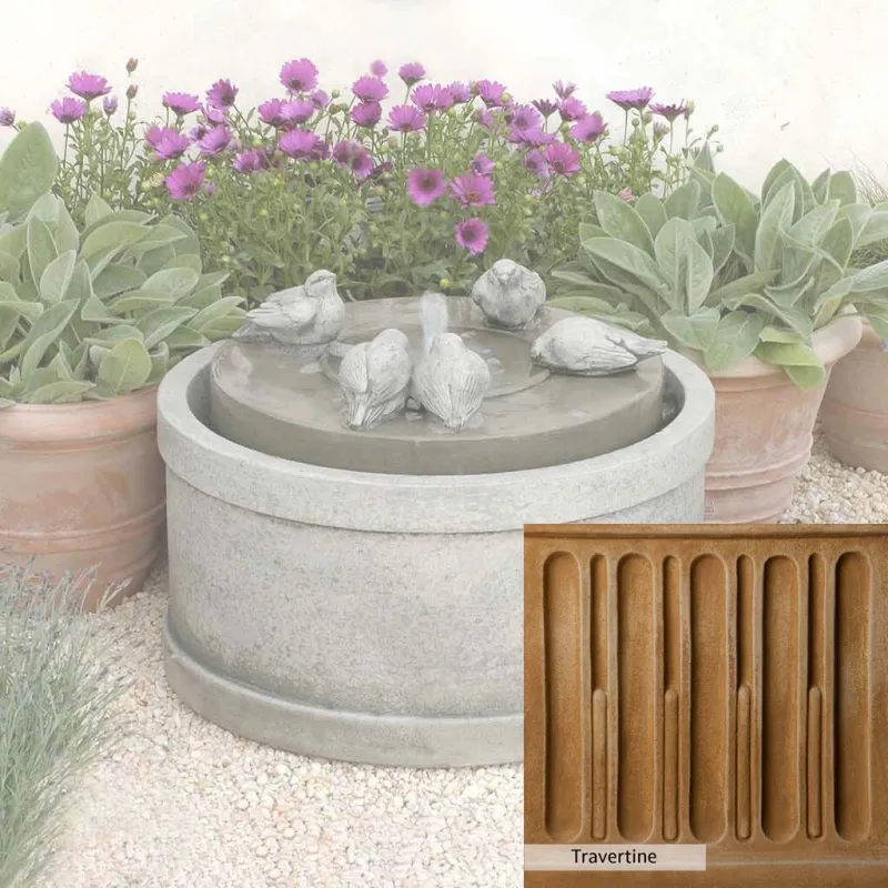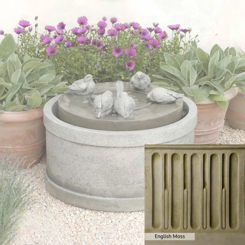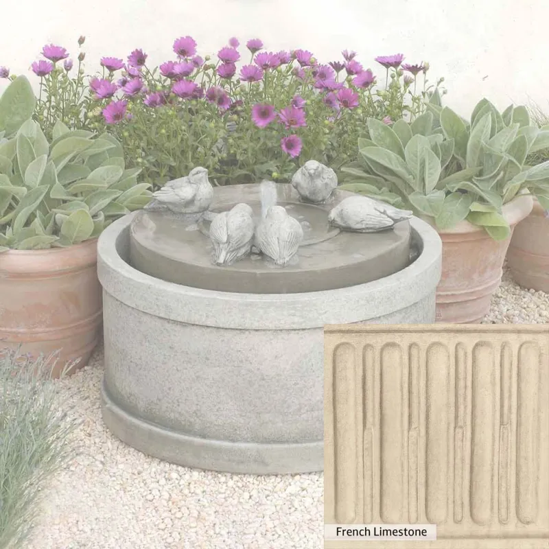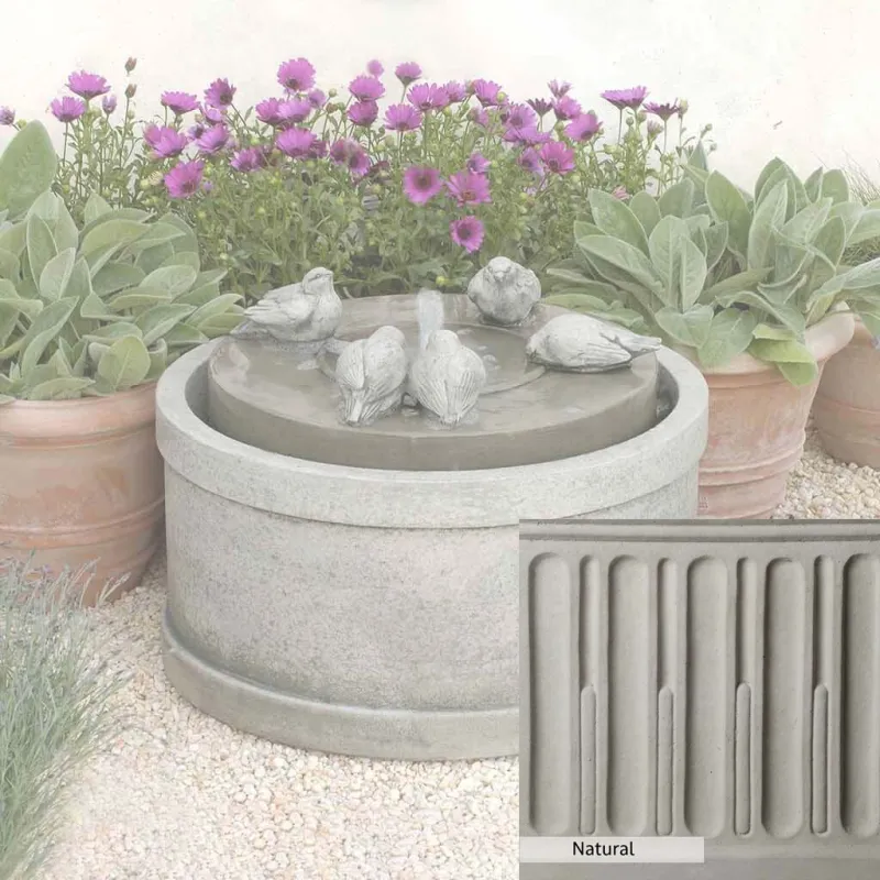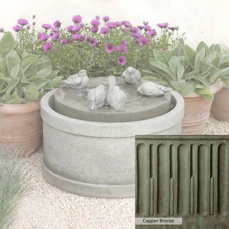 Skilled artisans in the USA handcraft the Passaros Fountain. The Campania team applies a unique patina, making each piece one-of-a-kind. This fountain is shown in the Greystone color. Due to materials, manufacturing processes, and variations in photography conditions, natural differences can occur in size, weight, and color. The actual color may vary from the photo.