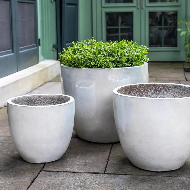 The Campania International Rafi Planter in Pearl set of 3 Planter Set has been meticulously designed for the ideal garden aesthetic. Crafted by Campania artisans in Southeast Asia, these high-fired and intricately designed planters can reach temperatures of up to 1000 degrees centigrade, providing them with frost- and weather-resistance. Due to the handmade nature of these planters, some colors may vary. Sets can not be divided.