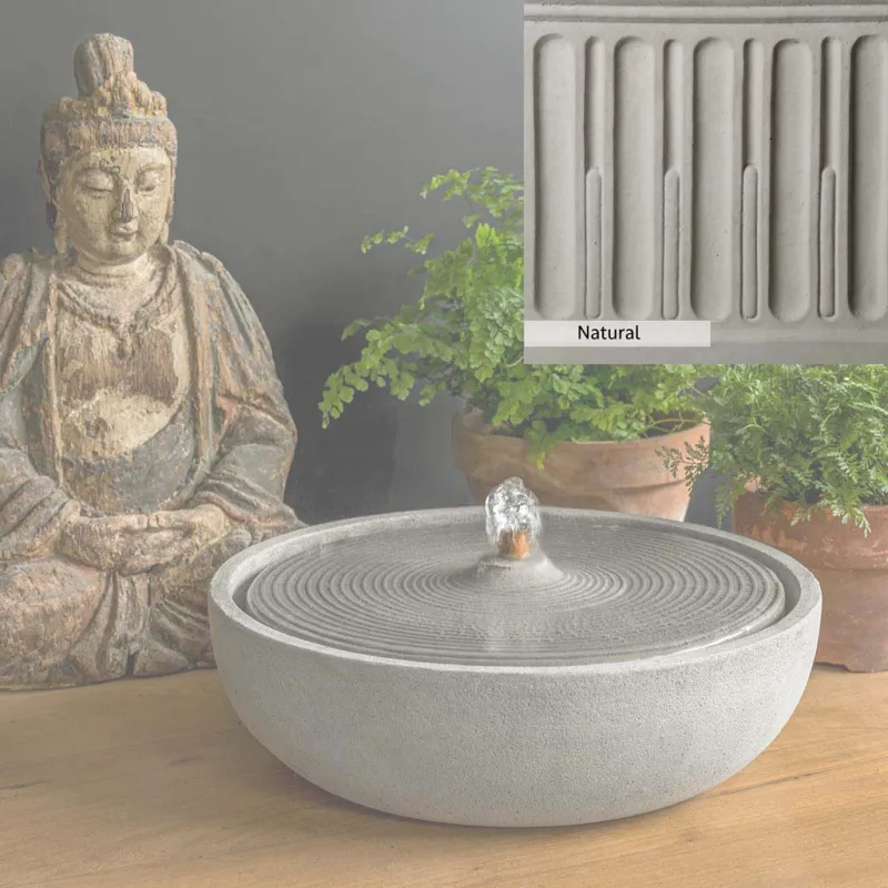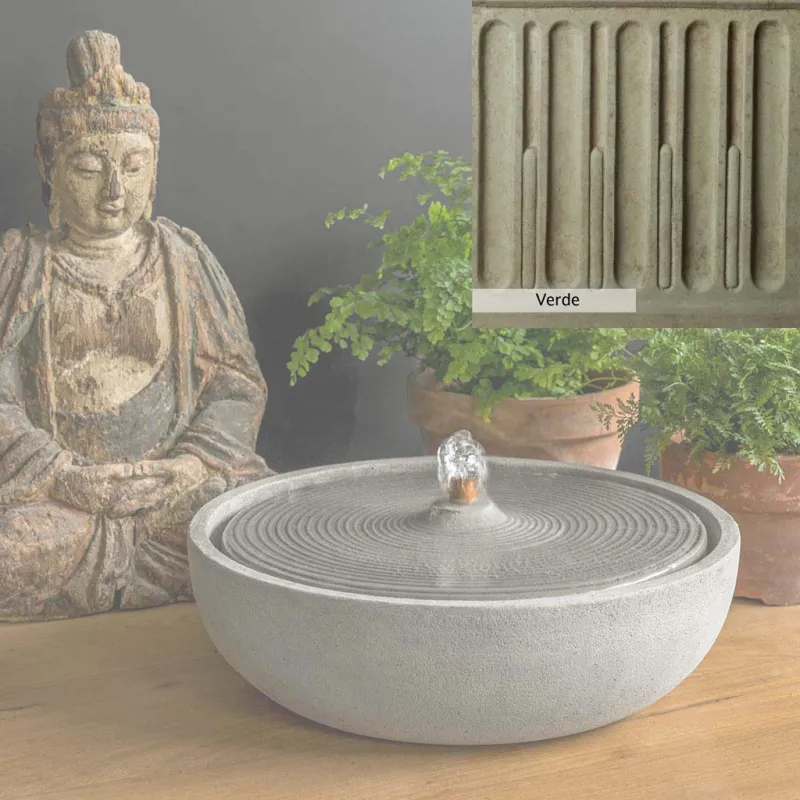 Skilled artisans in the USA handcraft the Ripple Fountain. The Campania team applies a unique patina, making each piece one-of-a-kind. This fountain is shown in the Alpine Stone color. Due to materials, manufacturing processes, and variations in photography conditions, natural differences can occur in size, weight, and color. The actual color may vary from the photo.