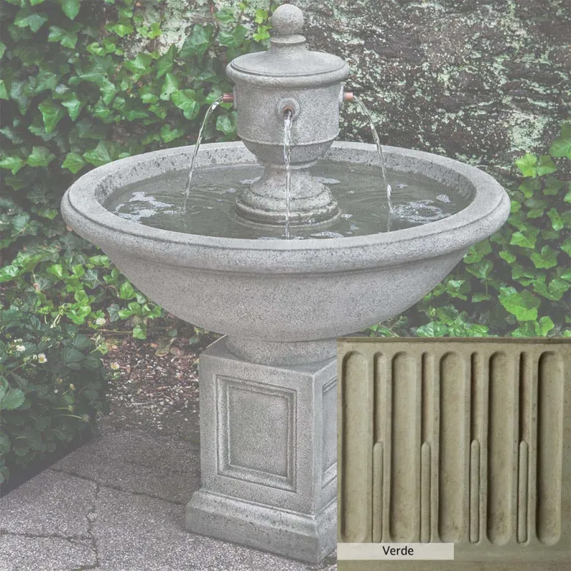 The Rochefort Fountain is handcrafted by skilled artisans in the USA. With their extensive experience, the Campania team applies a unique patina to ensure that each piece is special. This fountain is shown in the Alpine Stone color. Campania International’s proprietary cast stone blend is meticulously molded to create each piece used in the construction of this fountain. Due to the use of different materials and manufacturing processes, as well as varying photography conditions, natural variations in size, weight, and color can occur. The actual color may differ from the photo.