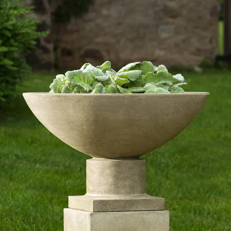 Campania International Savoy Planter with Pedestal is shown in the Verde (VE) patina. This modern cast stone Savoy Planter with Pedestal will add the finishing touch to your garden, patio, courtyard, or entryway. Cast stone is a traditional building material used to construct bridges and cathedrals. It is ideal for gardens because it is durable against the elements and will age beautifully over time.