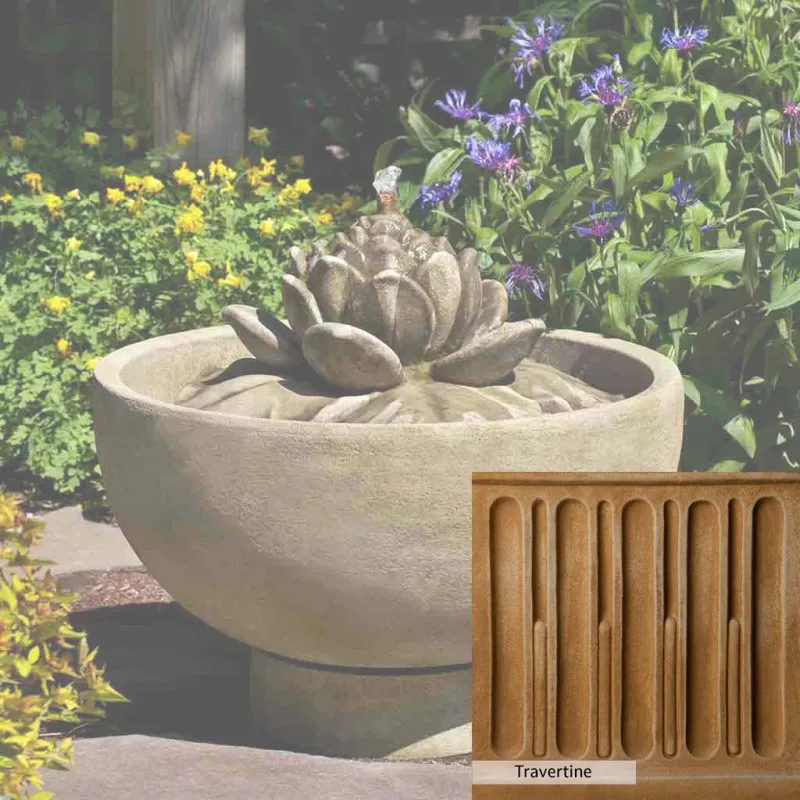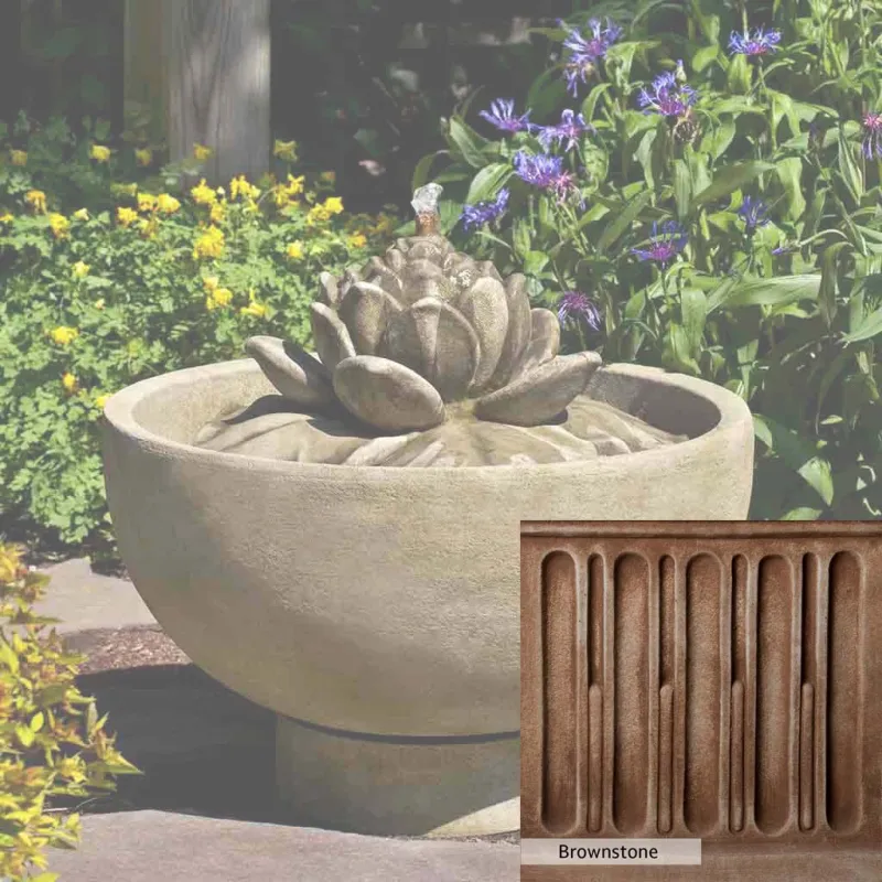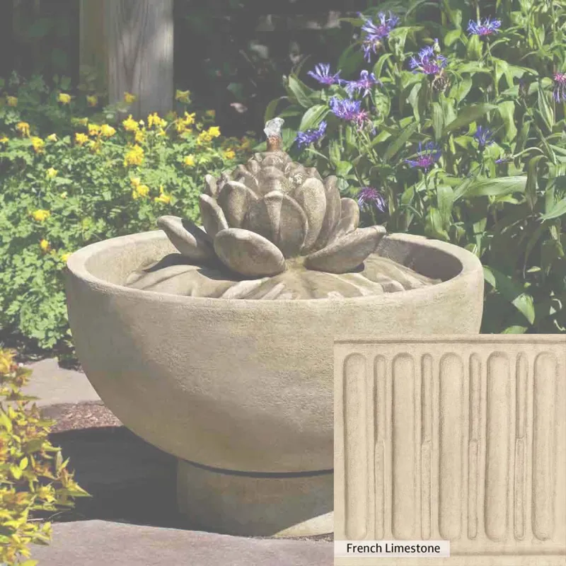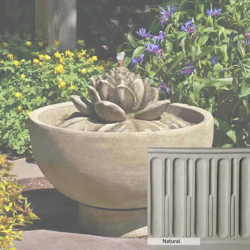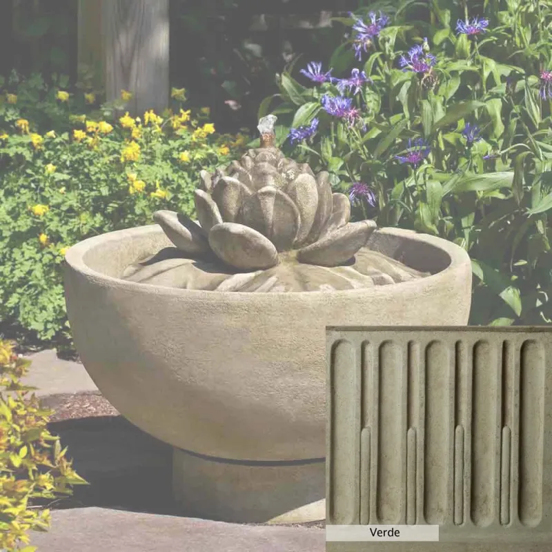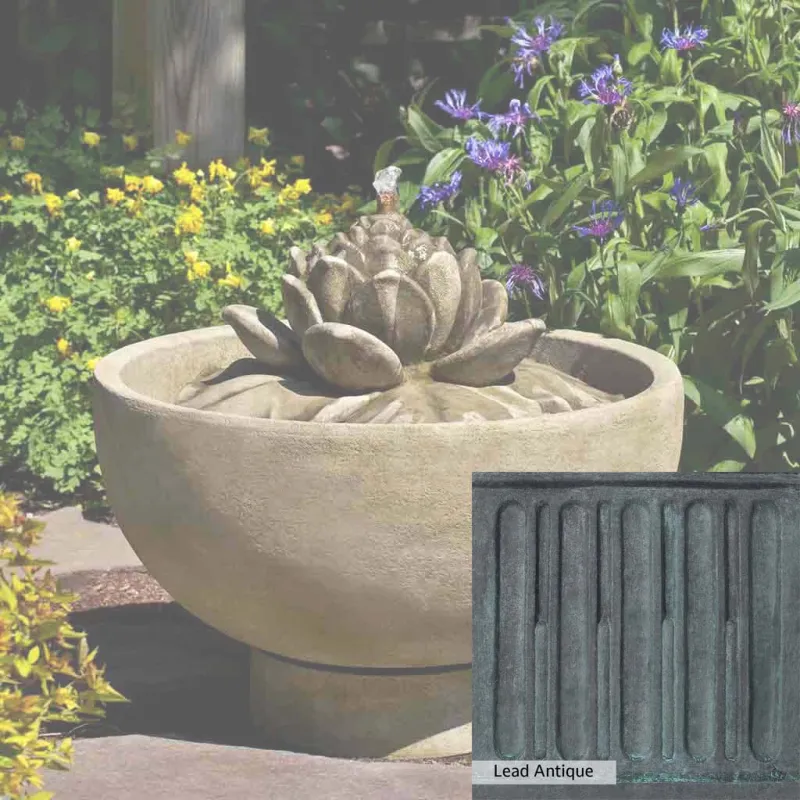 Skilled artisans in the USA handcraft the Smithsonian Lotus Fountain. The Campania team applies the unique patina using their experience, making each piece one-of-a-kind. This fountain is shown in the English Moss color. Campania International’s unique cast stone blend is meticulously molded to create each piece used in the construction of this fountain. Due to the materials, manufacturing processes, and variations in photography conditions, natural differences can occur in size, weight, and color. The actual color may vary from the photo.