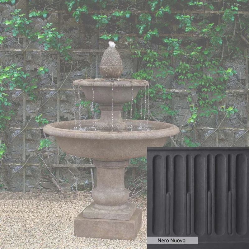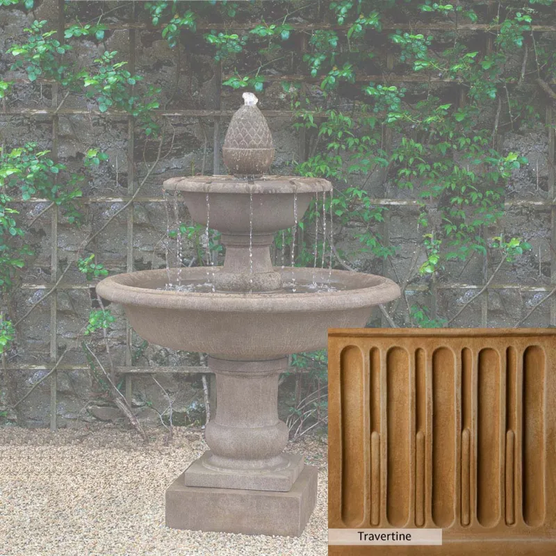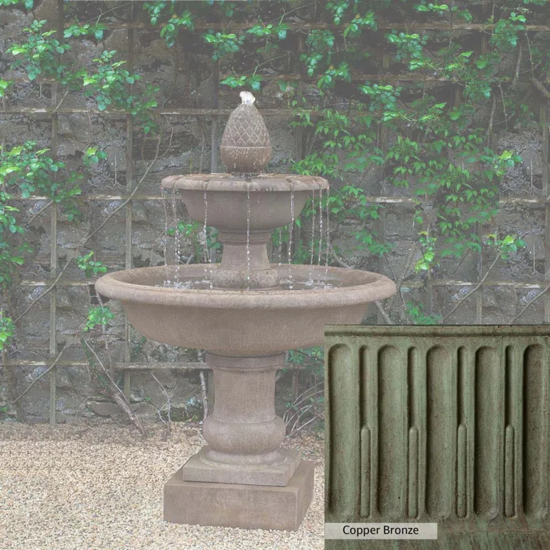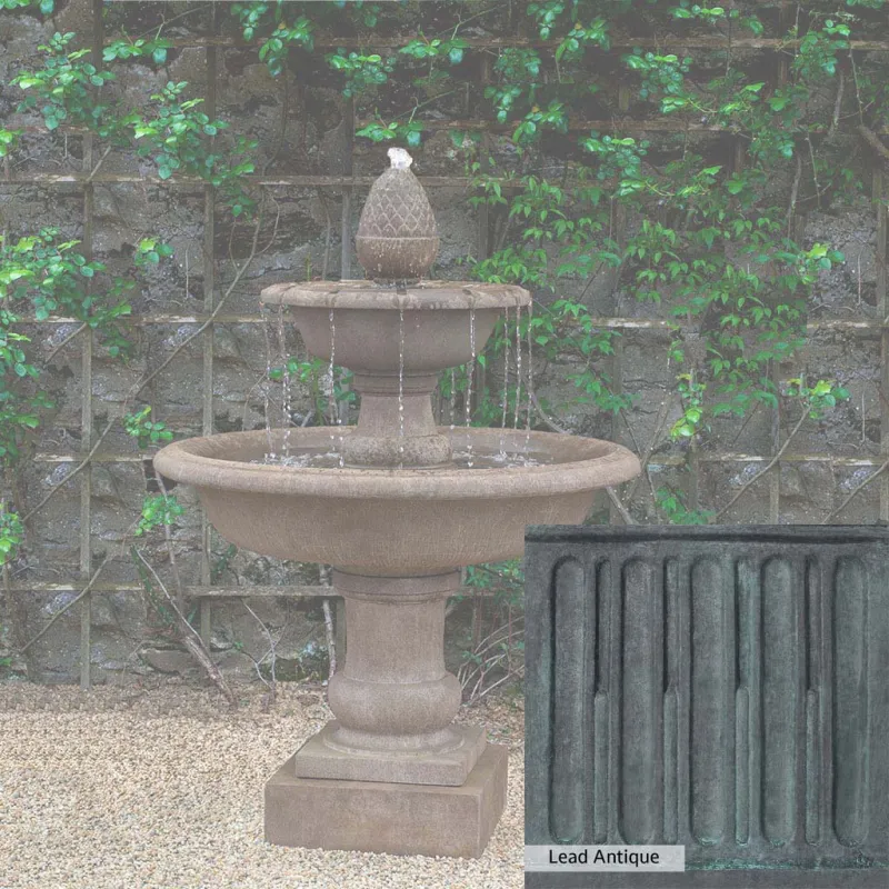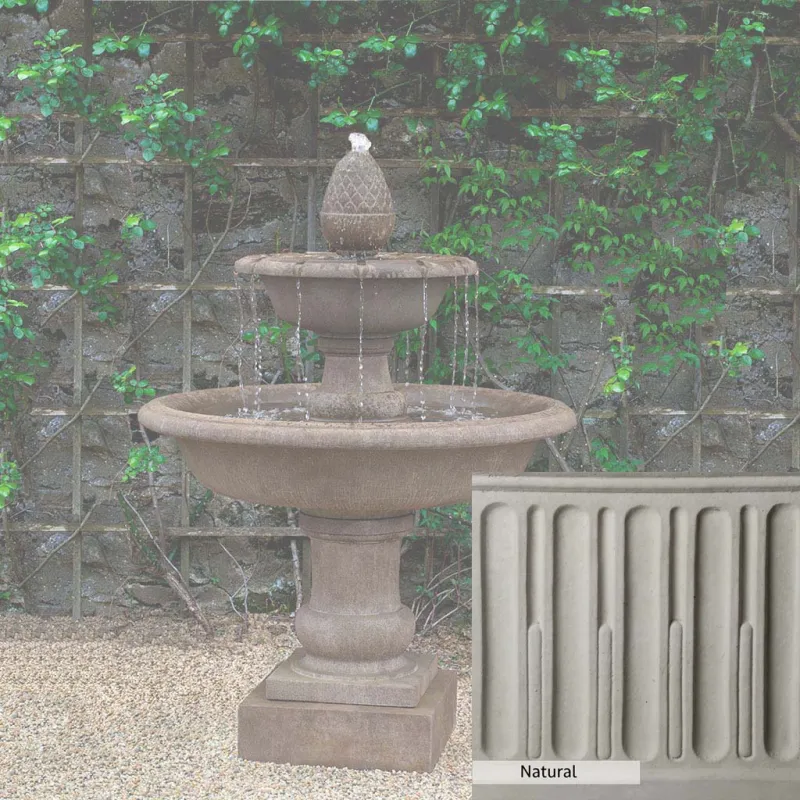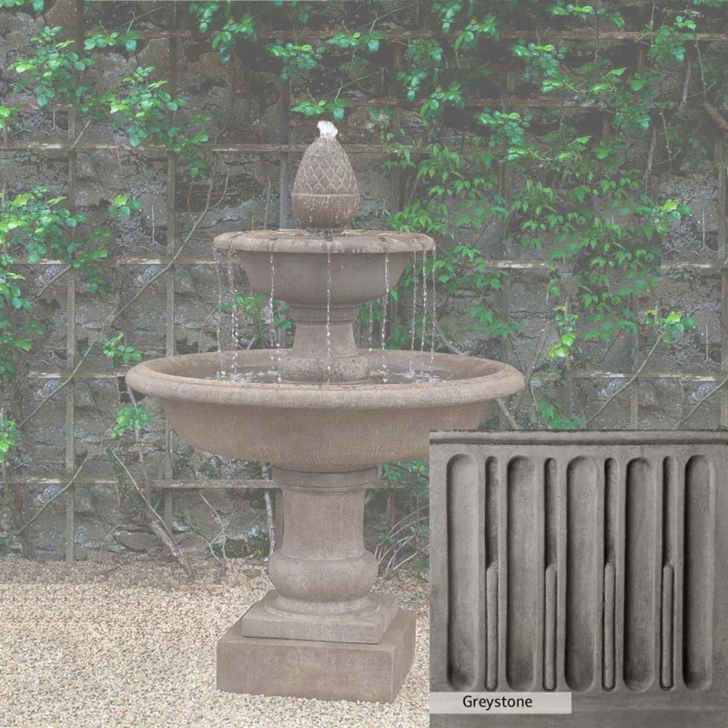The Wiltshire Fountain is handcrafted by skilled artisans in the USA. The Campania team applies the unique patina with experienced hands, making each piece special. This fountain is featured in the Aged Limestone color. Campania International’s exclusive cast stone blend is expertly molded to create each piece in the construction of this fountain. Due to the materials used and manufacturing processes, as well as variations in photography conditions, natural differences may occur in size, weight, and color. The actual color may vary from the photo.