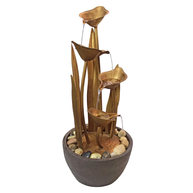 With burnished copper finish, natural river stones and sweet water music, the Copper Botanical fountain is sure to be the crowning statement in your garden or home or on your patio. Multiple cascading streams of water flow endlessly from each stylized lotus to create an oasis with a peaceful, meditative atmosphere. Our Design Toscano-exclusive fountain can be placed indoors or out and constantly recycles water from a hidden reservoir. In a quality designer resin urn base, this investment in garden art features an integrated, UL-listed, indoor/outdoor pump.