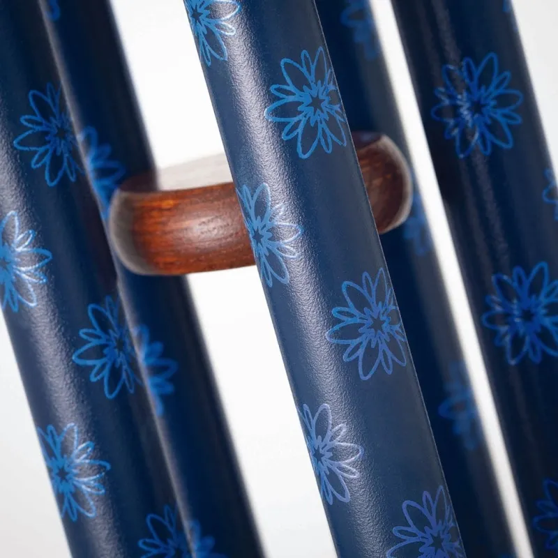 This chime is designed to produce a harmonious pentatonic scale and features dahlia flowers silk-screened on its colorful tubes. Dahlias were first found growing in Mexico by Spaniards in 1525. The indigenous people used them as a food source, gathered them in the wild, and cultivated them. The Aztecs also used them for medicinal purposes. Today, dahlias are grown in various colors and have a flower head resembling a star with surrounding rays. Over 57,000 cultivars of dahlias are officially registered through the Royal Horticultural Society.