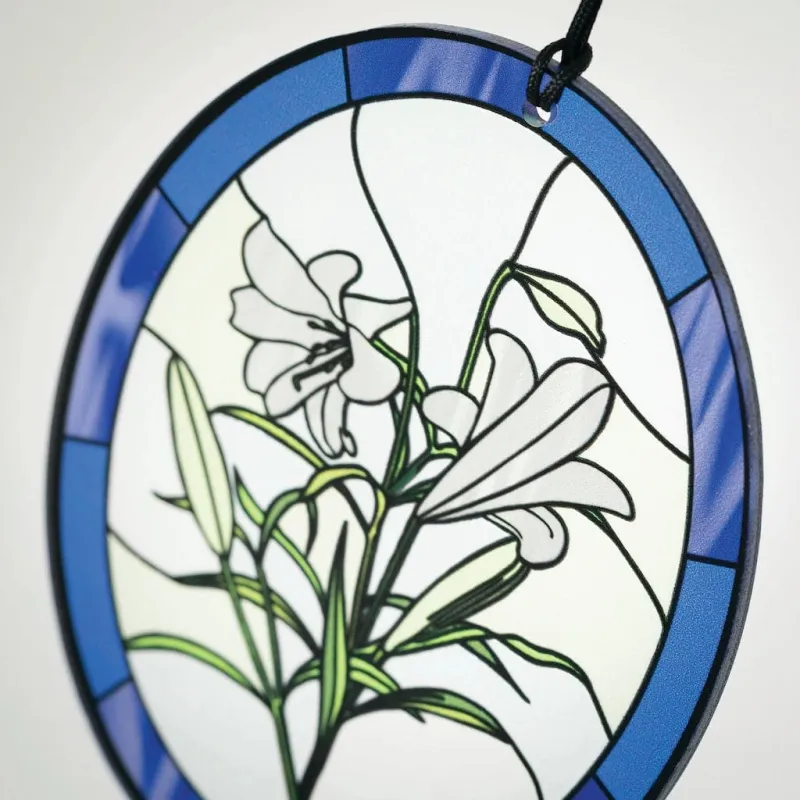 This stunning chime showcases a lovely lily windcatcher ornament crafted with a unique design inspired by the vibrant hues and embellished patterns of the Art Deco era. In Art Deco, flowers, birds, and other natural wonders were commonly depicted in paintings, sculptures, stained glass, textiles, and fashion. Tuned to an ancient pentatonic scale, this chime uplifts the soul and evokes a sense of tranquility, honoring the diversity of art and nature surrounding us.