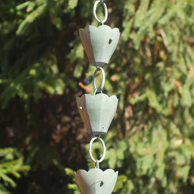 The Good Directions Tulip Rain Chain is expertly crafted and constructed from pure copper, creating a functional yet aesthetically pleasing design. The Blue Verde℠ finish adds a touch of historic charm, mimicking the appearance of aged copper. With 13 flower ornaments that are 4.25 inches wide, this 8.5-foot rain chain effectively directs water flow and creates a beautiful cascade from the rooftop to the ground. The sturdy cups on this rain chain can easily handle heavy rainfall. By replacing your standard gutter downspout with this unique rain chain, you will learn to appreciate the rain. Each rain chain is built to last and is backed by an industry-leading Lifetime Warranty, ensuring your satisfaction. Good Directions has been handcrafting exquisite pure copper pieces for over 38 years, enhancing the homes of proud homeowners.