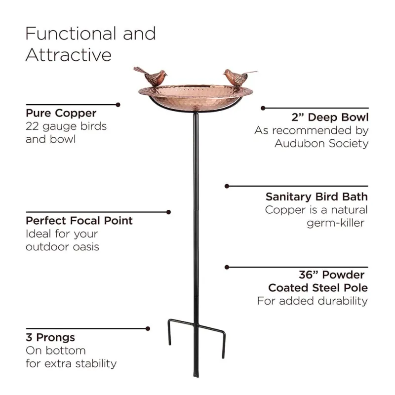 The Pure Copper Bird Bath with two birds and a garden pole from Good Directions is an excellent addition to any outdoor space. It enhances the ambiance and attracts beautiful birds to your backyard. The sturdy multipronged garden pole is a reliable support for the elegant copper bowl—the combination of creativity and high-quality materials results in a durable piece built to last. The standing bird bath atop the included garden pole will attract various birds. The decorative edge doubles as a resting place for feathered friends to break between drinks.