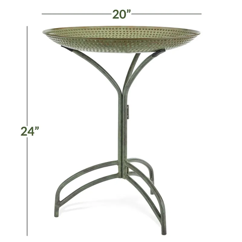 Add a touch of elegance to your outdoor area with the Good Directions 20-inch Blue Verde Copper Bird Bath. Designed for bird lovers, this versatile birdbath is perfect for any backyard. The foldable stand makes moving around in gardens or patios easy, while the 4-prong base adds extra stability. The basin has a depth of 2.5 inches, and the Audubon Society recommends filling it to 2 inches for optimal use.