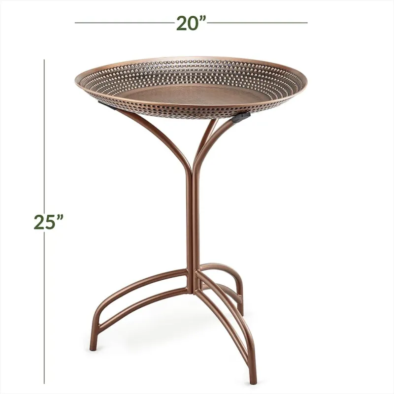 This superb bird bath, crafted by skilled American Artisans, is composed of premium materials and meticulously designed. Delicate hand-punched, beaded embellishments adorn the inner surface, while the exterior boasts a dark brass-rubbed finish. The basin floor showcases an intricate “etched linen” design, while the sturdy pedestal stand features an innovative “no tip” design crafted from durable, powder-coated steel. As the esteemed National Audubon Society recommended, this birdbath offers the perfect bath depth and exudes elegance.