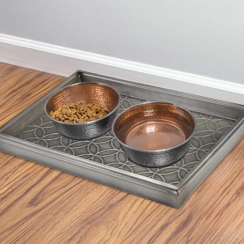 The Good Directions 20-inch Double Circles Boot Tray in Dark Zinc Gray Finish is a versatile and stylish solution for various uses. It can keep floors clean by storing shoes in the entryway or mudroom, as a potted plant holder, or as a designated pet bowl area. Its padded bottom prevents sliding for added convenience.