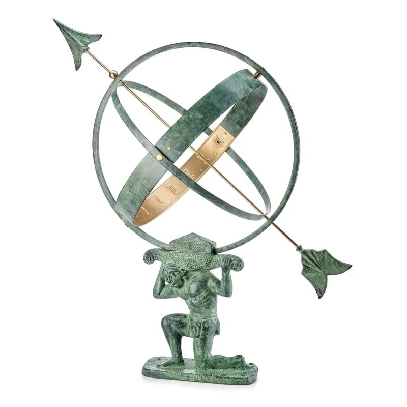 Since 100 B.C., the Greeks have been utilizing sundials to keep track of time. This 28-inch Verdigris Atlas Armillary Sundial with Brass Accents from Good Directions is a remarkable piece that will attract eyes no matter where it is installed. It is a remarkable functional artwork where the brass sphere is inscribed with Roman numerals to follow the sun’s movement – similar to how the Greeks did centuries ago.