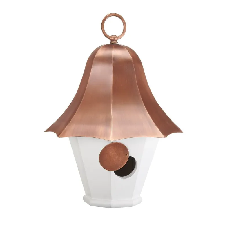 Good Directions’ Bell Top Bird House offers an aesthetically pleasing addition to any garden, featuring a compatible size for many birds. The Bell Top architectural style provides a 1 ¼ inch entry for nesting, protecting inhabitants from unwanted predators. This birdhouse is built with sturdy mango hardwood, featuring air vents for ventilation and drainage holes for quick cleaning. A 2-inch hole can also be found on the back, with a copper sliding door for easy access.