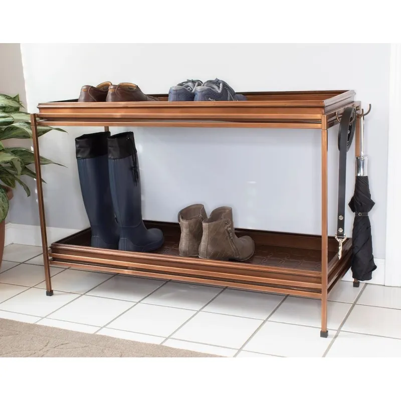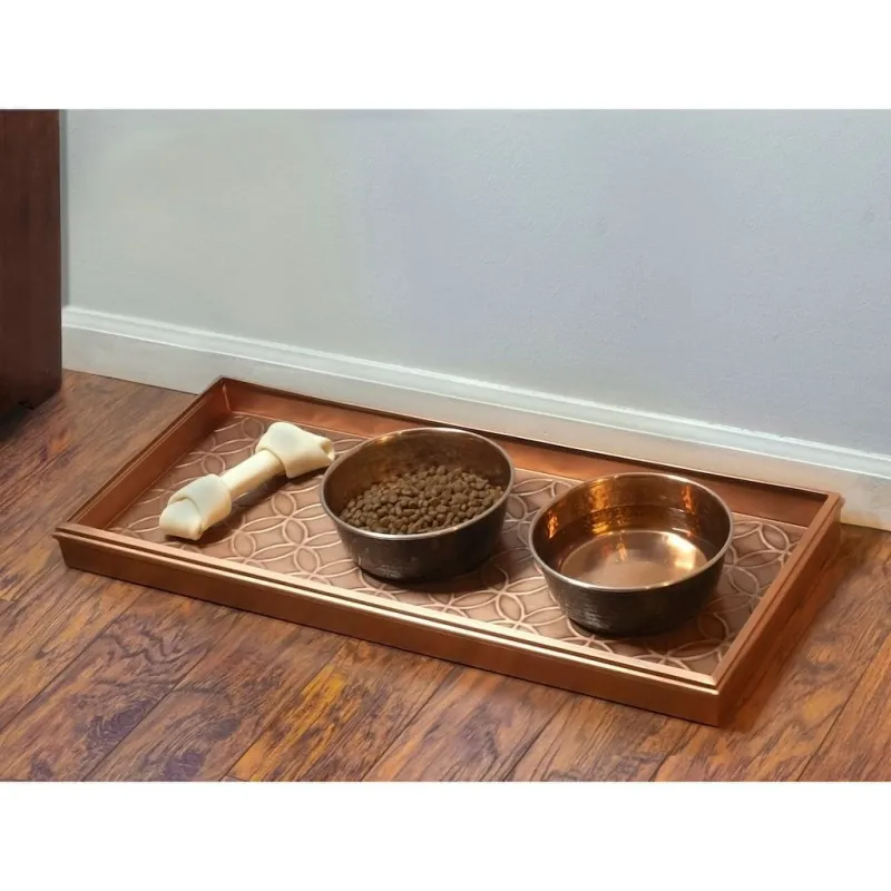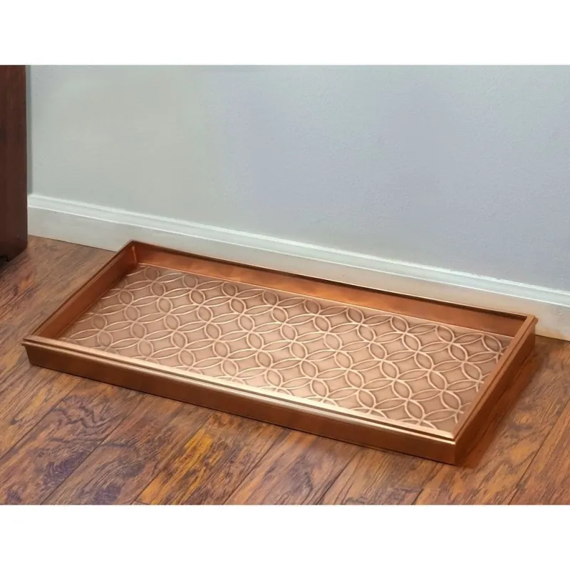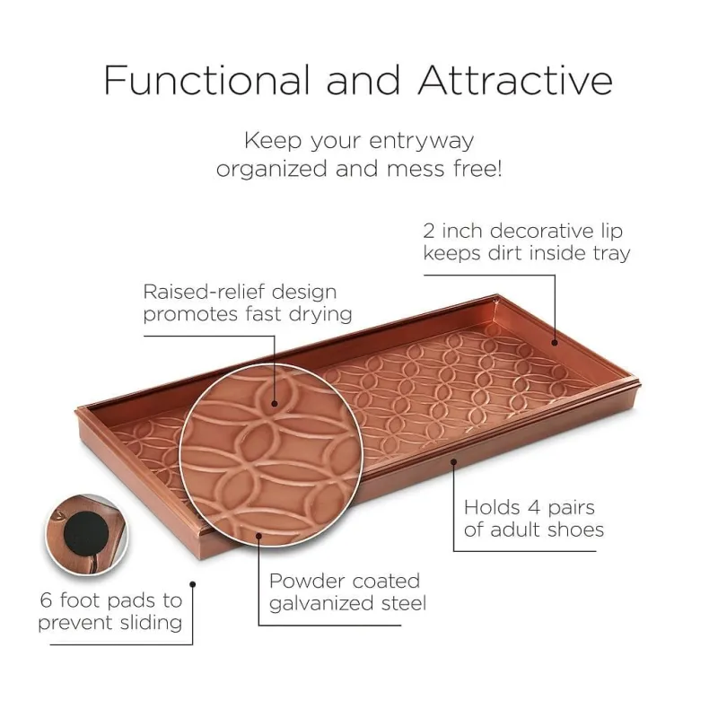 The Double Circles Copper Boot Tray by Good Directions is an attractive and versatile accessory that can be used in various ways to keep your home clean and tidy. You can use it to store shoes in the entryway or mudroom, keeping the floors free of dirt and grime. It can also be used as a stylish home for your potted plants or as a no-mess zone for your pet’s bowls. The tray features a padded bottom to prevent sliding, ensuring everything stays in place.
