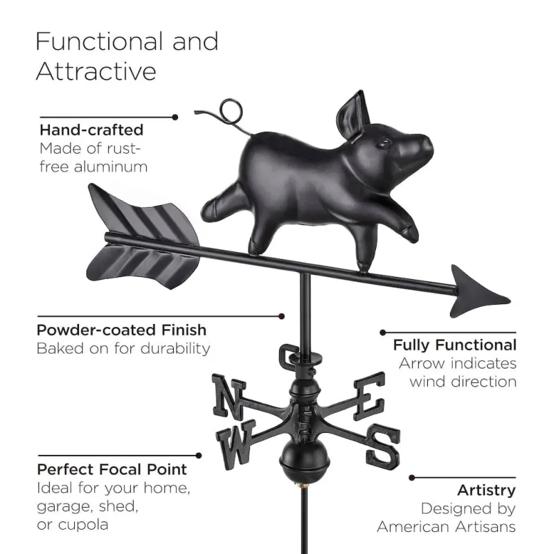 A contented pig always keeps its head and tail held high. The pig enjoys the feeling of the wind blowing through your garden. Good Directions weathervanes are known for their exceptional style, quality, and durability, making them an excellent choice for homeowners who take pride in their homes. Add The Art of Outdoor Living℠ to your home with this high-quality, heirloom piece.