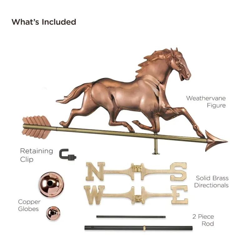 This elegant copper thoroughbred is a weathervane design that has been around since 1850. It is perfect for adorning your home, garage, cupola, barn or gazebo. Good Directions has been making high-quality copper weathervanes since 1982, and this piece is no exception. It is both durable and stylish, making it an ideal addition for any proud homeowner.
