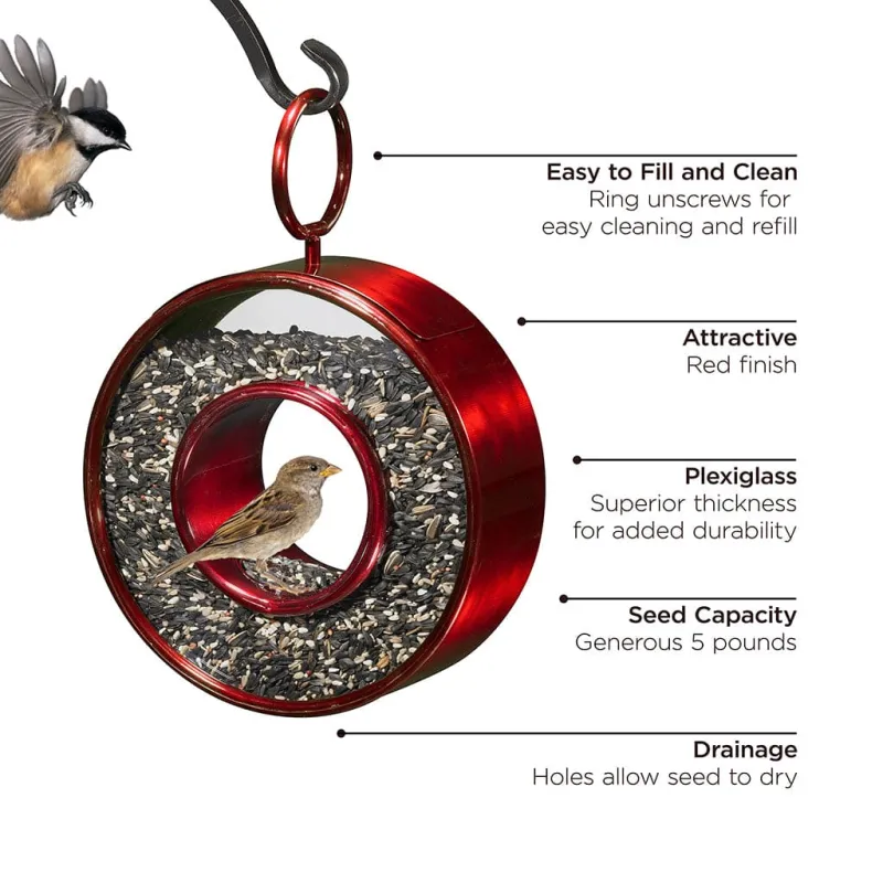 Introducing our circular Fly-Thru™ bird feeder, a collaboration between skilled local artisans and bird enthusiasts. This feeder is designed for convenience, allowing birds to rest or grab seed on the go. Easy-fill panels make refilling quick and the strong plexiglass ensures lasting durability. With a 5-pound seed capacity, it’s perfect for attracting a variety of birds. For even more feathered visitors, consider our copper mesh Just In Time feeder.