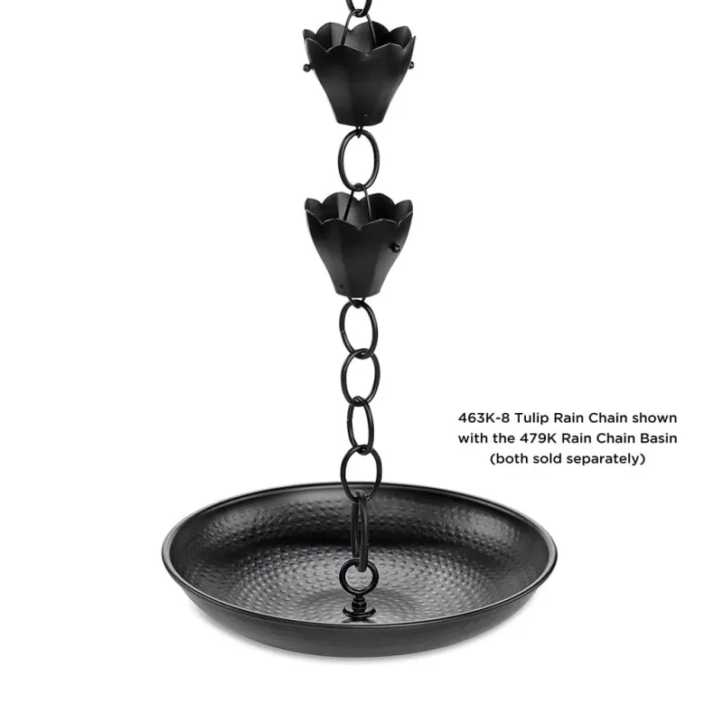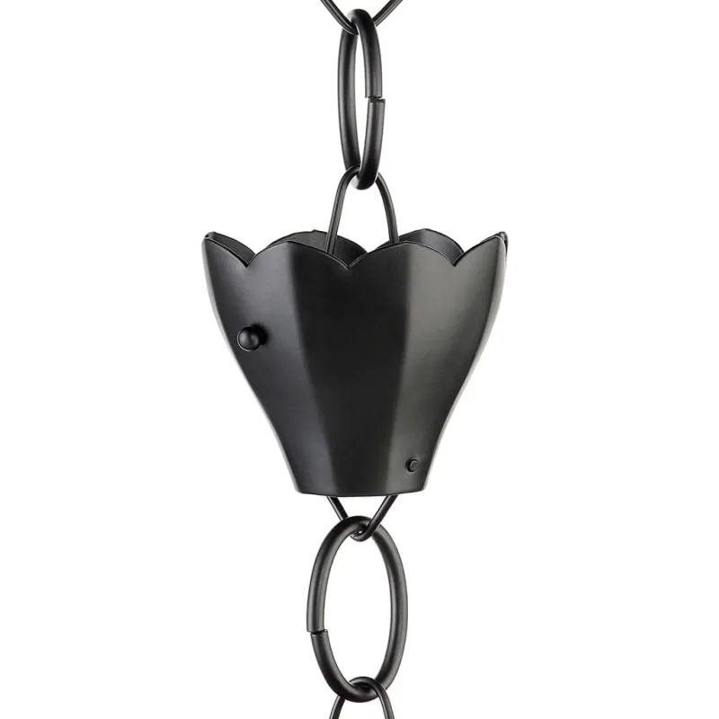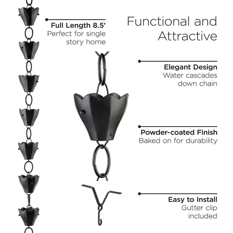 The Good Directions Modern Farmhouse 13 Cup Tulip Black Aluminum 8.5ft. Rain Chain is an expertly crafted, functional, and visually stunning addition to any home. With 4.25-inch wide flower ornaments and a length of 8.5 feet, this rain chain effectively directs water from rooftop to ground while adding a touch of beauty. Designed and handmade since 1982, Good Directions continues to produce quality and durable products for homeowners who take pride in their homes.