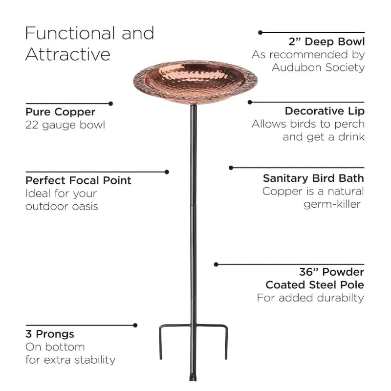 - Copper is a natural germ-killer which helps maintain a sanitary bird bath