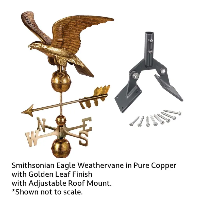 The eagle became the emblem of the new American Union in 1782. Today, you can add this iconic symbol to your home by installing the Smithsonian Eagle Weathervane. This weathervane is pure copper and has a beautiful Golden Leaf finish, which artisans carefully handcraft. The Golden Leaf adds to its majestic look and will weather over time, creating a stunning contrast with the pure copper underneath. You can install our 401AL roof mount on the rooftop of your home, garage, cupola, barn, gazebo, or shed. If you want to display it indoors, we recommend our 582-floor stand or 403R garden stand if you place it in or around your yard.