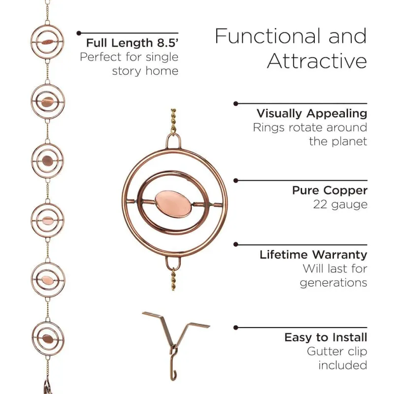 The Good Directions Stellar Rain Chain is a functional, beautiful rain chain handmade using pure copper. The chain features thirteen 4.5-inch rotating stellar rings linked with a brass chain to create an 8.5-foot rain chain that allows water to cascade beautifully from the rooftop to the ground. Each orbiting ring is carefully crafted to revolve as water travels down. The rain chain comes with a gutter clip that makes installation easy. You can welcome rain in style by replacing your ordinary gutter downspout with the Stellar Rain Chain.