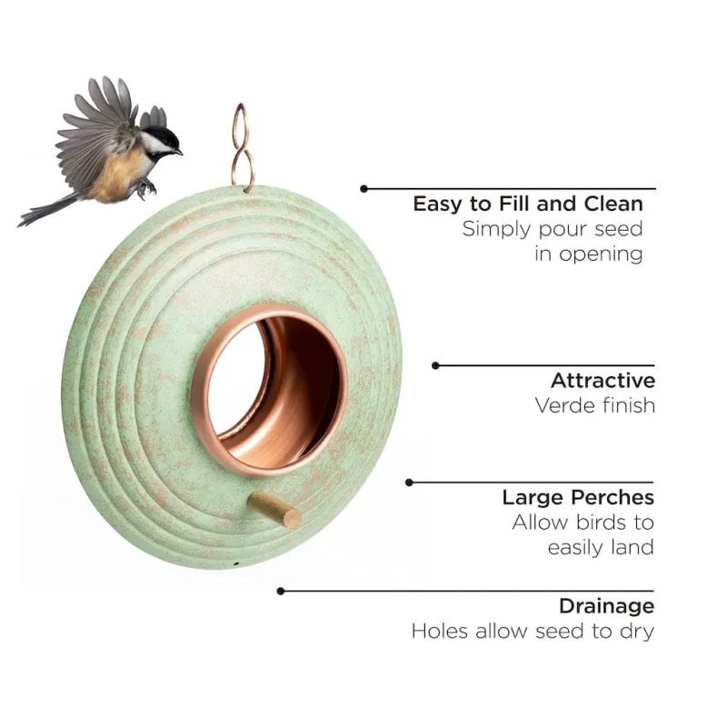 Enhance your garden with the Fly-Thru™ bird feeder from Good Directions. Developed with the collaboration of skilled artisans and bird enthusiasts, this feeder offers a hassle-free experience for both you and your feathered friends. The spacious perches on either side provide convenient access to seeds, while the stunning Azure hue and copper accents add a touch of elegance to your outdoor space. With a seed capacity of 1.5 pounds and bottom drainage holes, this feeder ensures dry and fresh seeds. For a complete birding paradise, opt for the set of three vibrant Fly-Thru™ feeders.