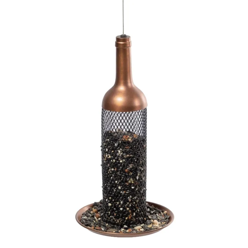 Attract your avian companions to gather and dine at this captivating bird feeder, fashioned after a wine bottle. The unique copper finish and mesh tube design accommodate multiple birds, while a raised lip on the tray prevents spills. With easy filling and drainage holes to keep seeds dry, the feeder can hold up to 1.5 pounds of seed.