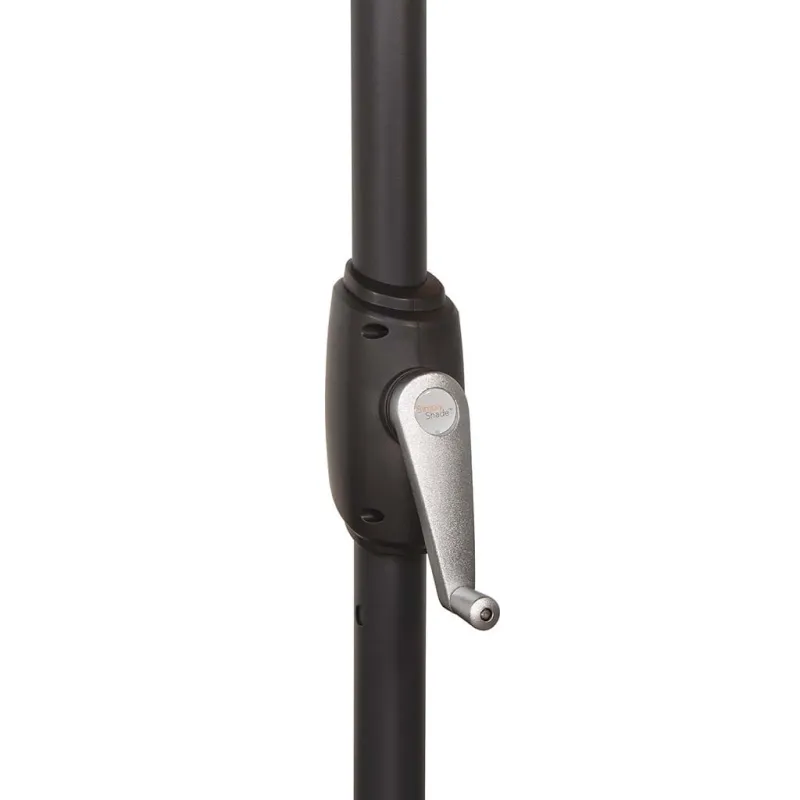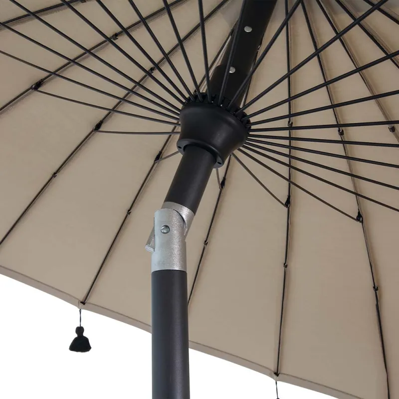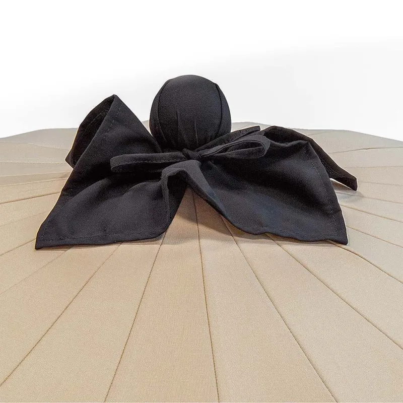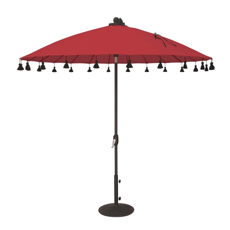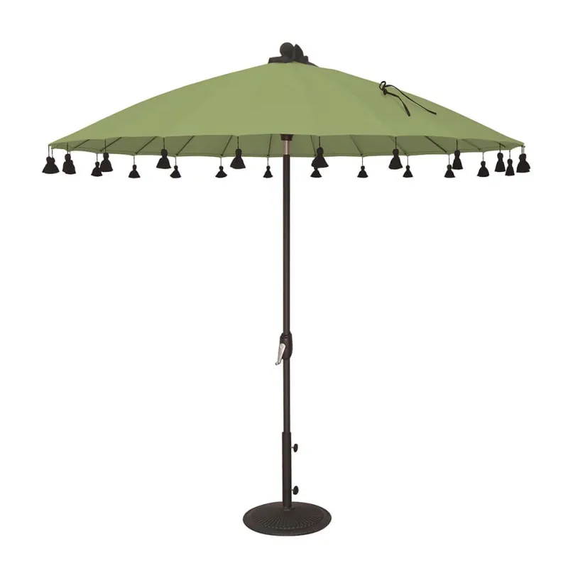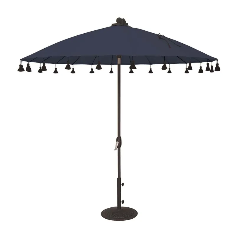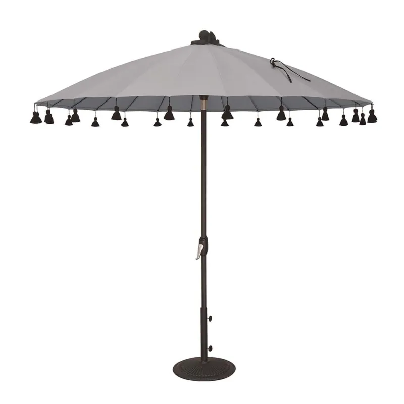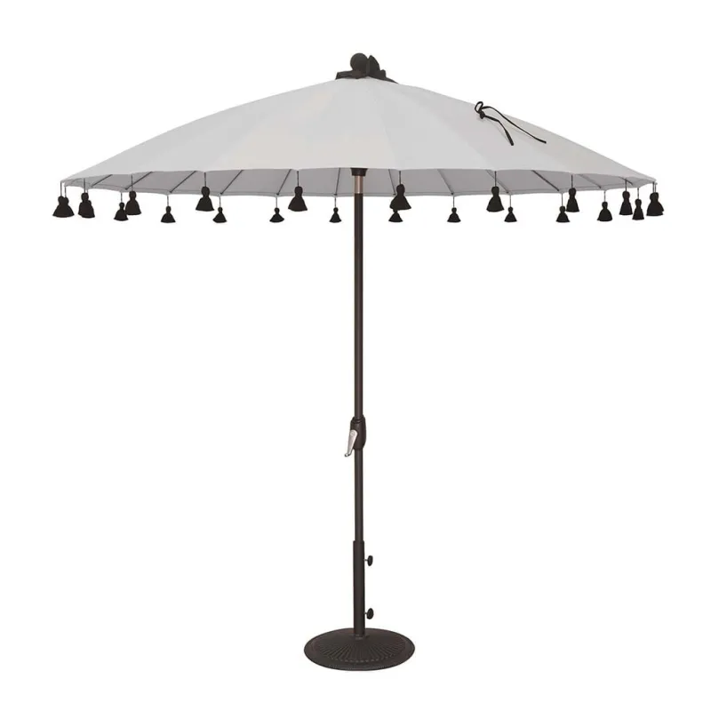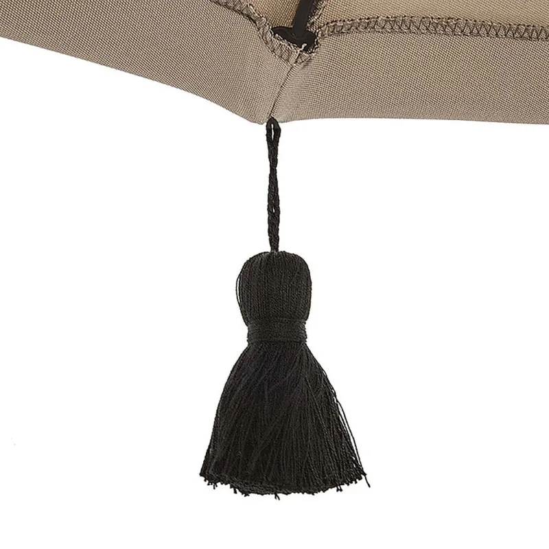 The 8.5ft Isabela Market Umbrella proudly features a unique and romantic design with a fabric-wrapped finial and 24 steel ribs and tassels in Sunbrella black. The Auto Tilt Market Umbrella allows users to follow the sun for continual outdoor enjoyment, even while sitting down entertaining guests. Once the canopy is open, continue to crank the handle and the canopy will tilt infinite degrees of shade and comfort