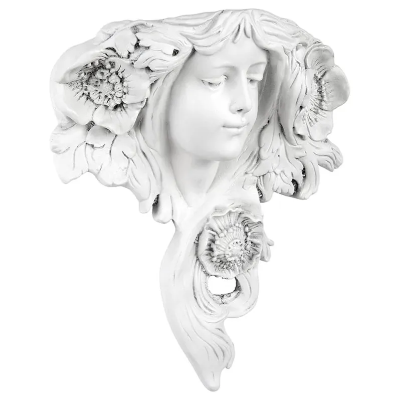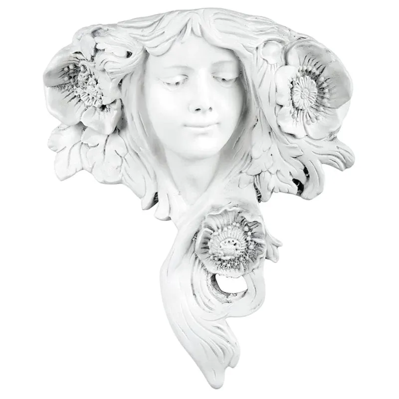 Flowing tresses and blooming poppies grace this Art Nouveau wall sculpture cast from an antique we found in a French market. Crafted in designer resin for use in home or garden, this decorative classic is ideal for foliage or as a wall ornament in any living area.