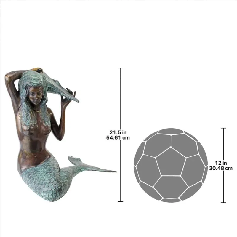 Part maiden, part fish, our lush mermaid casts her legendary lure at garden’s edge or, with the addition of a pump, as a fountain for your pond or pool. Our Isle of Capri Mermaid Statue has been sculpted with plenty of eye-pleasing detail, boasting an arched tail, flowing tresses and a lithe figure, expertly finished with a hand-applied two-tone multidimensional sepia and color-washed emerald verde patina. The daughter of Neptune is individually cast in the traditional lost wax method, which highlights her expressive face and exquisite, arched tail and guarantees lasting beauty. Sure to be a focal point, this Design Toscano exclusive heirloom-quality bronze garden statue conveys that you take the exterior of your home as seriously as the interior. Piped to optionally cascade flowing water from the shell in her hands into your pond, pool or fountain. Simply add the optional 290 GPH pond pump kit to create beautiful water music in your garden.