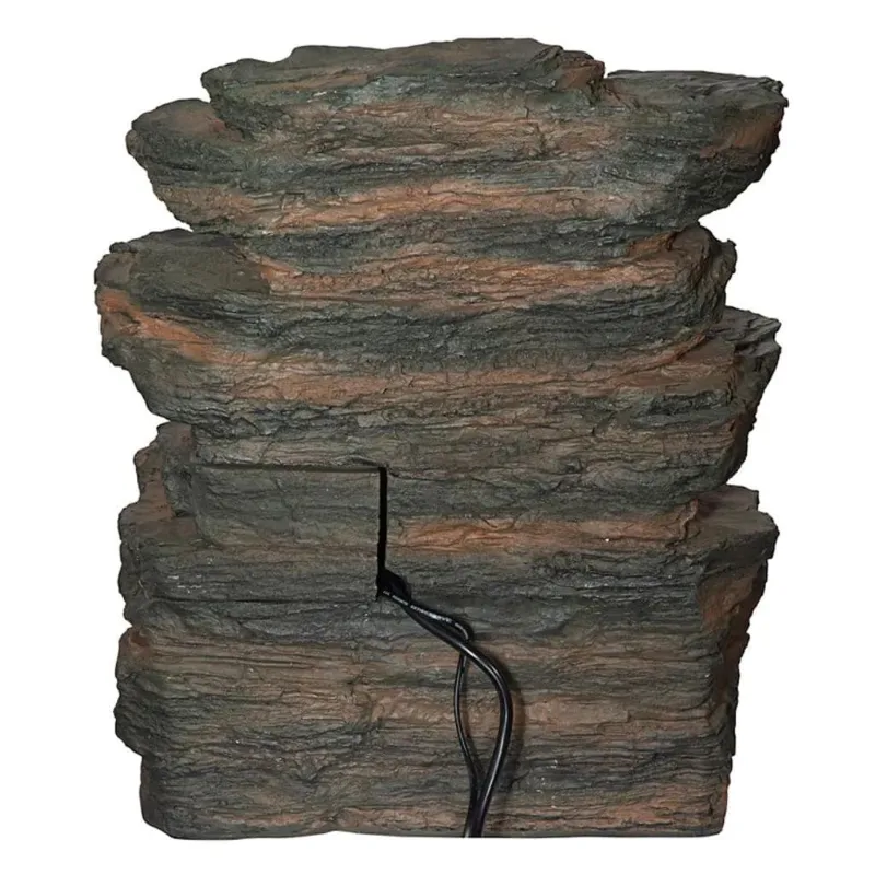 Reminiscent of the old west when finding a rocky cascading stream was a joy to behold. Tumbling and flowing down a weathered crag, six streams flow into four cool pools to create the relaxing sound of water music and a peaceful meditative atmosphere in any space celebrating the great outdoors. Place this amazingly detailed rustic illuminated fountain anywhere, with four basin pools highlighted by the included LED lights, you can even enjoy this garden fountain in the evening. Cast in quality designer resin and hand-finished to replicate natural weathered stone strata, our tabletop fountain also features an integrated, UL-listed indoor/outdoor pump that constantly recycles water from a hidden reservoir and low-voltage LED lights for dramatic effect. Another creative sculptural fountain from the Design Toscano “Small Wonders” collection that will make a delightful gift for yourself or a friend!